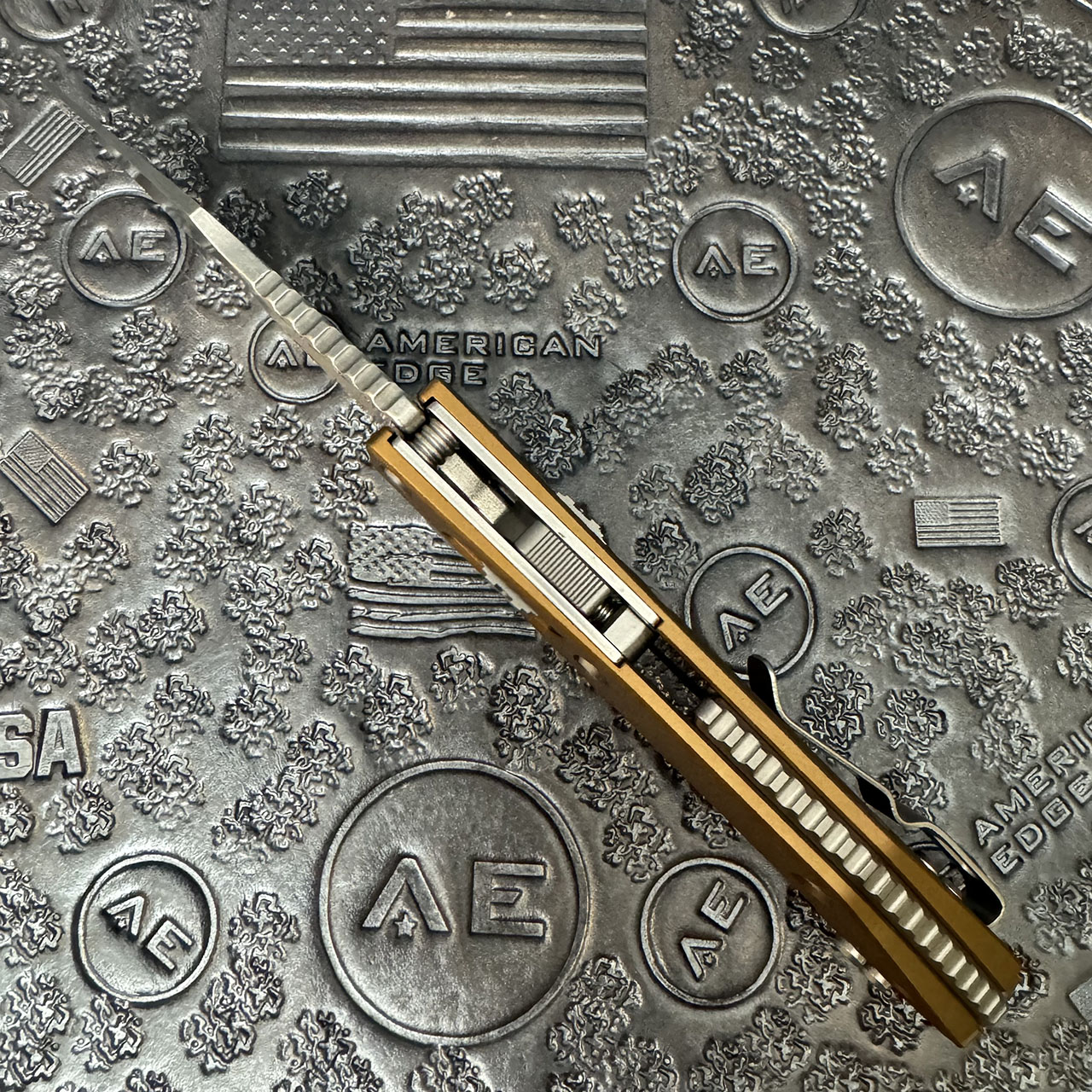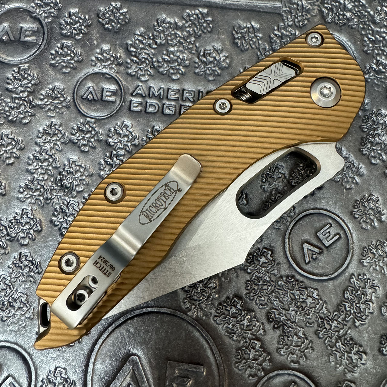 This model features fluted tan aluminum handle scales. Stonewash finished M390MK stainless steel partially serrated blade, a nice big finger choil and jimping on the finger choil and thumb ramp for excellent grip. Apocalyptic finished hardware, reversible pocket clip, and lanyard hole. The pocket clip features the model info and production date. The blade features the Microtech and Borka logos. Brand new in box.