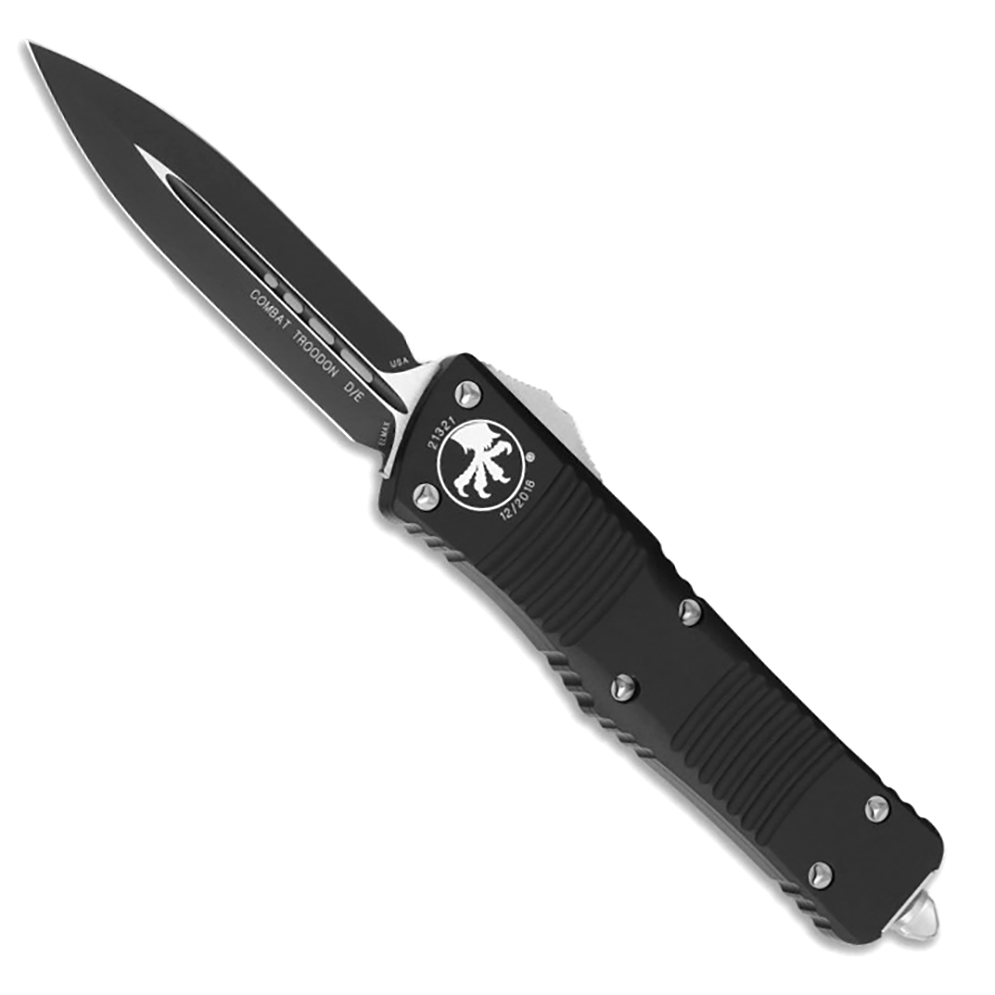 This model features a black anodized 6061-T6 aluminum with grooves and jimping. Black finished ELMAX stainless steel double edge dagger blade with standard cutting edges. Bead blast finished stainless steel glass breaker, reversible pocket clip, and hardware. The pocket clip features the Microtech logo. The blade has the Microtech logo and model information. The handle has the Microtech Claw logo, serial number, and production date. Brand new in box.