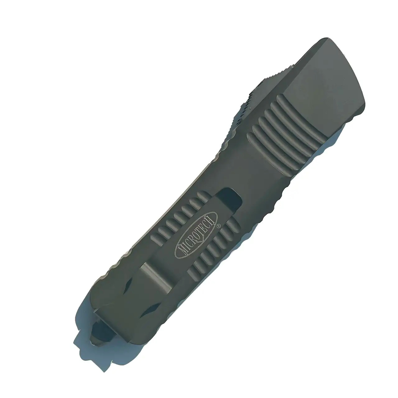This model features a OD green cerakoted aluminum handle with grooves and jimping for enhanced grip. Cerakote finished M390 stainless steel double edge dagger blade with a fully serrated cutting edge on one side. Cerakote OD Green finished hardware, glass breaker, and reversible pocket clip. The pocket clip features the Microtech logo. The blade has the model information. The handle has the Microtech Claw logo, serial number, and production date. Brand new in box.
