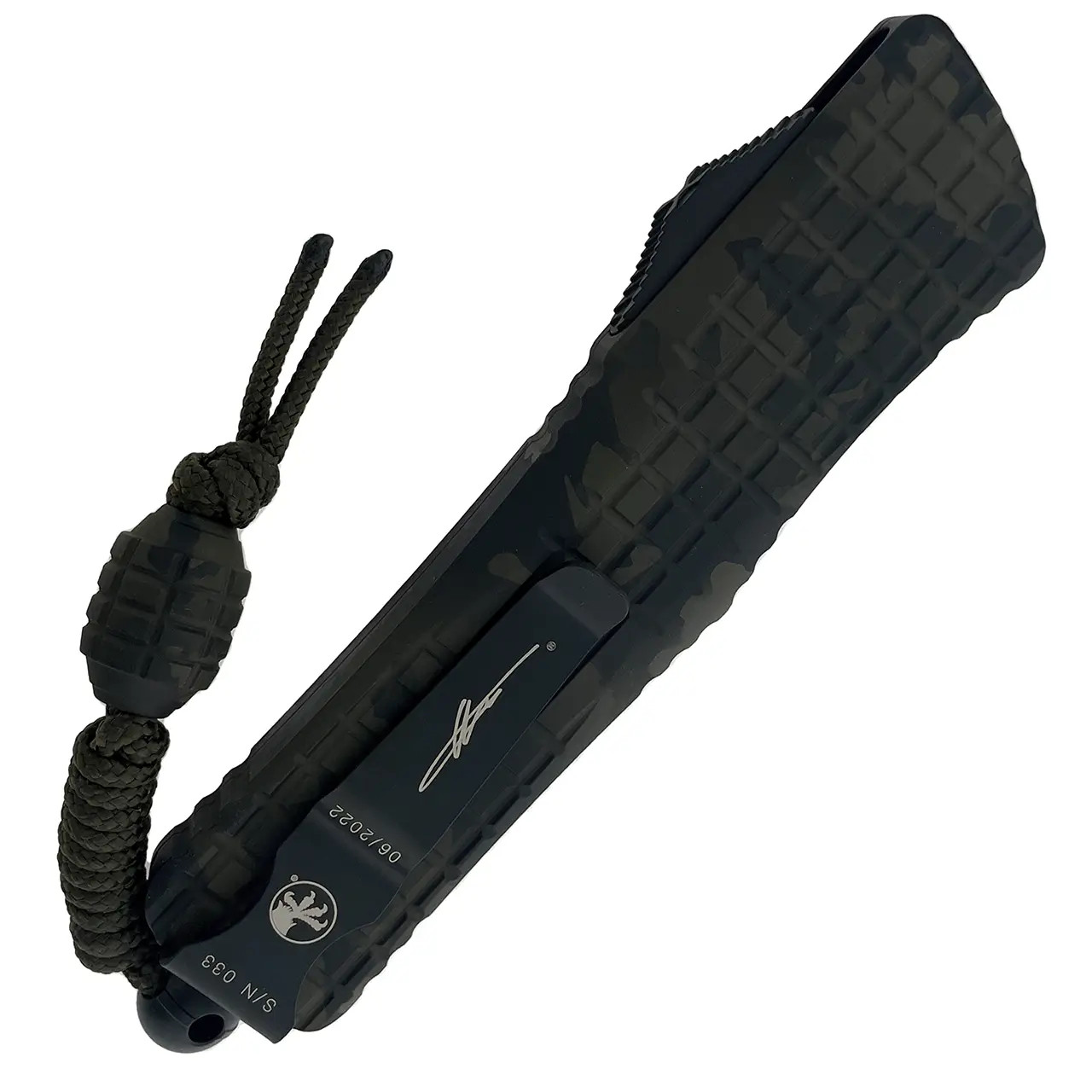 Microtech Combat Troodon D/E Frag Olive Camo Full Serrated Grenade Lanyard Bead Signature Series 142-3FROCS