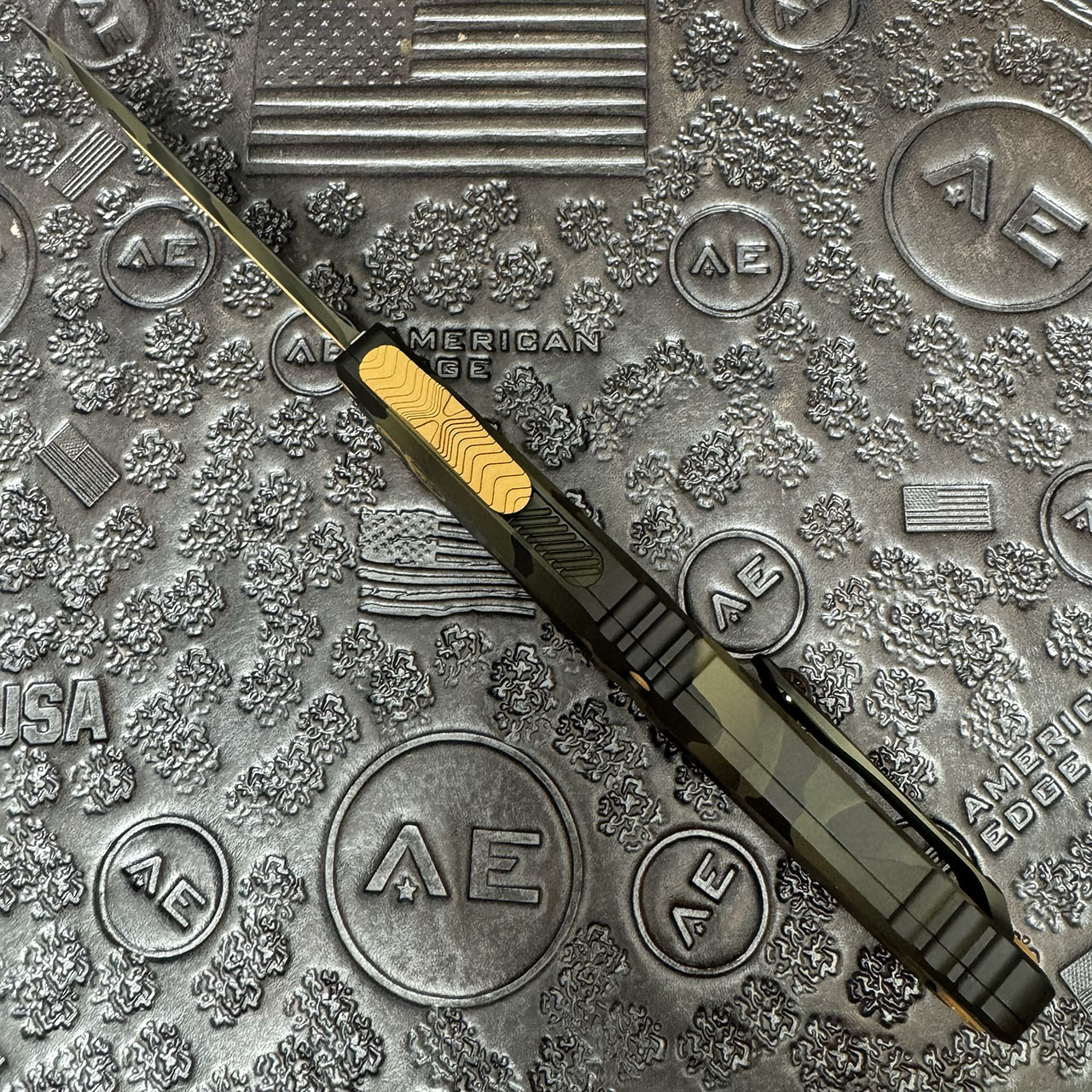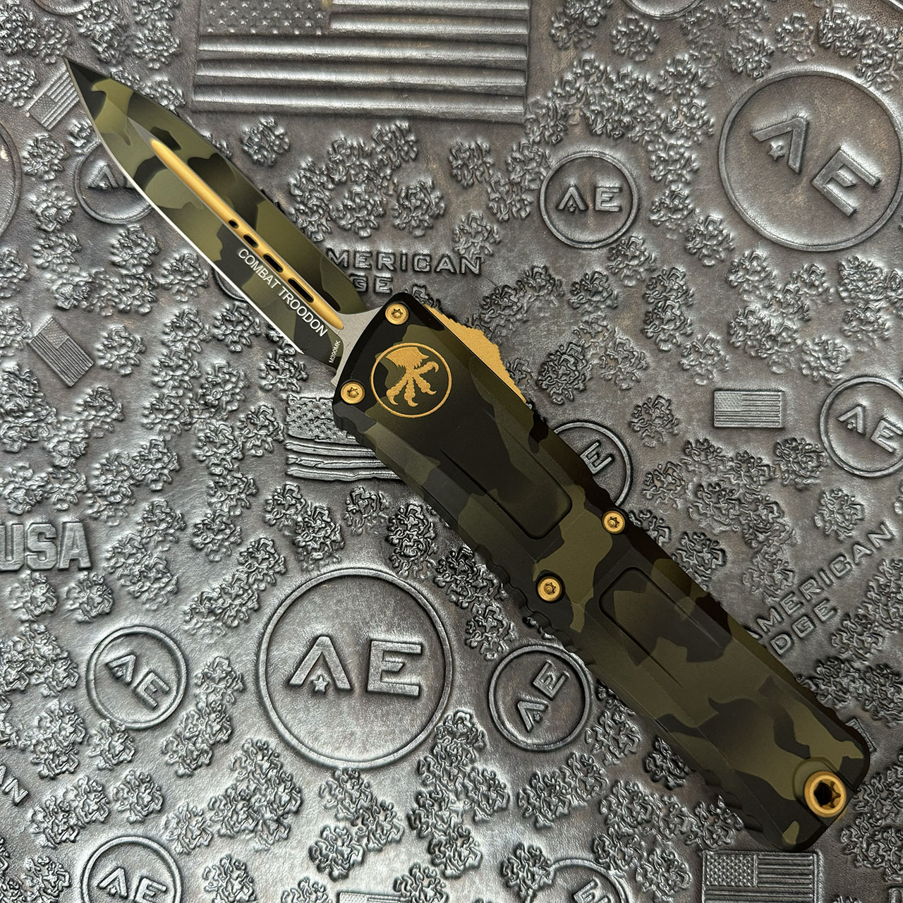 Microtech Combat Troodon D/E Gen III Olive Camo Standard Signature Series Gold Accents 1142-1OCGS