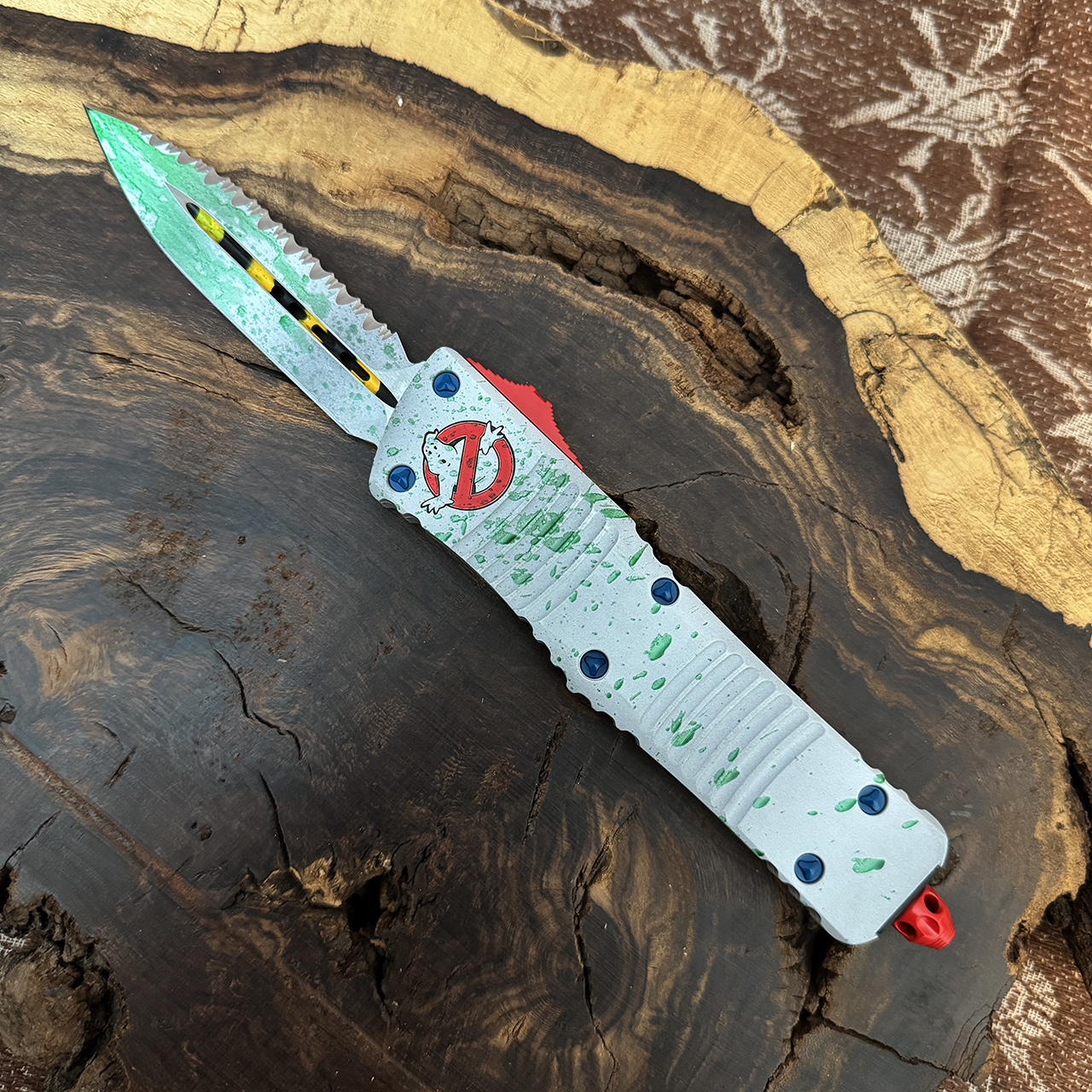 Microtech Combat Troodon D/E Ghostbusters Slime White Full Serrated Signature Series 142-3GBS
