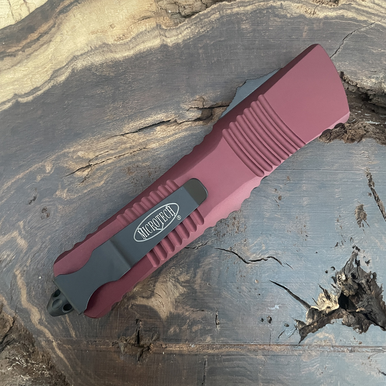This model features a merlot anodized 6061-T6 aluminum handle with grooves and jimping for enhanced grip. Black finished M390 stainless steel double edge dagger blade with partially serrated cutting edges on both sides. Black finished hardware, glass breaker, and reversible pocket clip. The pocket clip features the Microtech logo. The blade has the model information. The handle has the Microtech Claw logo, serial number, and production date. Brand new in box.