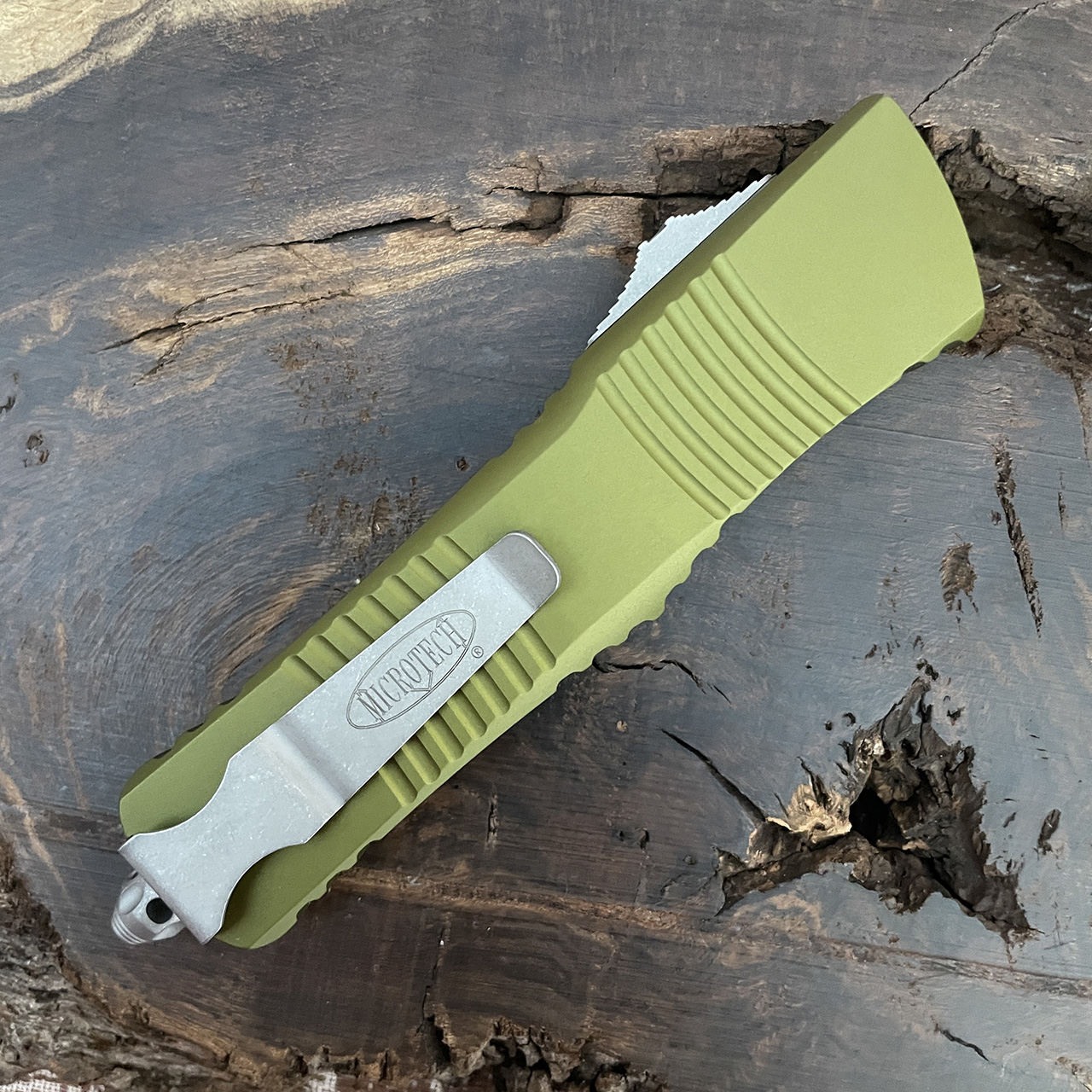 This model features a OD Green anodized 6061-T6 aluminum handle with grooves and jimping for enhanced grip. Apocalyptic finished M390 stainless steel double edge dagger blade with partially serrated cutting edges on both sides. Bead Blast finished hardware, glass breaker, and reversible pocket clip. The pocket clip features the Microtech logo. The blade has the model information. The handle has the Microtech Claw logo, serial number, and production date. Brand new in box.
