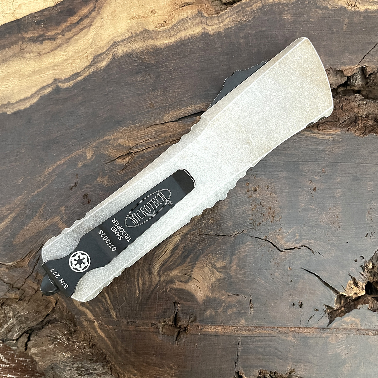 This model features a white and tan Sandtrooper themed Cerakoted 6061-T6 aluminum smooth chassis to resemble a Star Wars Sandtrooper theme. White and tan Sandtrooper themed Cerakote finished M390* stainless steel double edge dagger blade with standard cutting edges. Ringed stainless steel glass breaker, reversible pocket clip, and hardware. The pocket clip features the Microtech logo, production date, model informations, and Sand Trooper logo. The handle features a deep engraved Sand Trooper logo. Brand new in box.