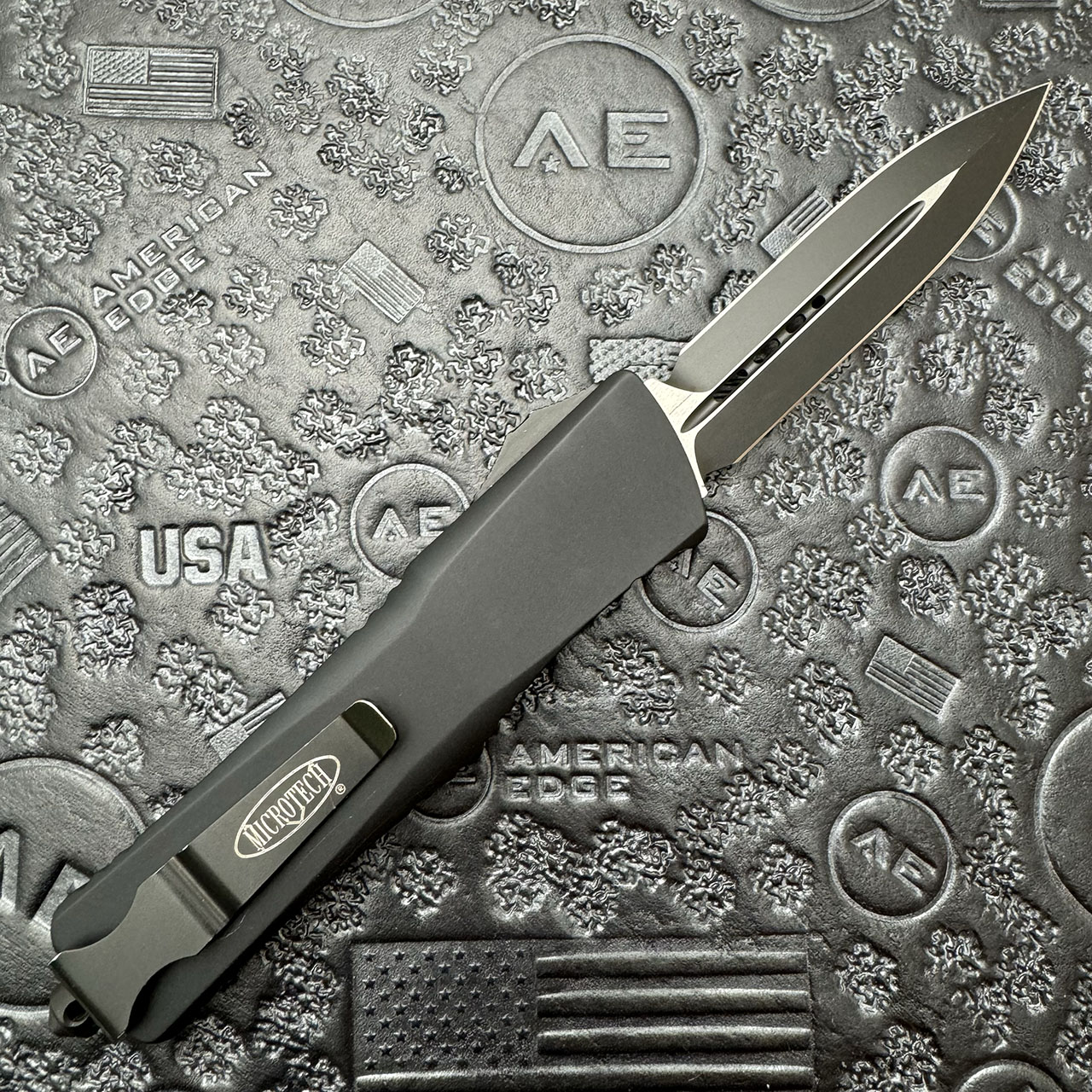 This limited edition model features a textured tan G-10 composite top scale with a black anodized 6061-T6 aluminum bottom scale. Black finished M390 stainless steel double edge dagger blade with standard cutting edges. Black tactical finished stainless steel glass breaker with lanyard hole, reversible pocket clip, and hardware. The pocket clip features the Microtech logo. The blade has the Microtech logo and model information. Minor pocket clip wear, otherwise in excellent pre-owned condition. No box.