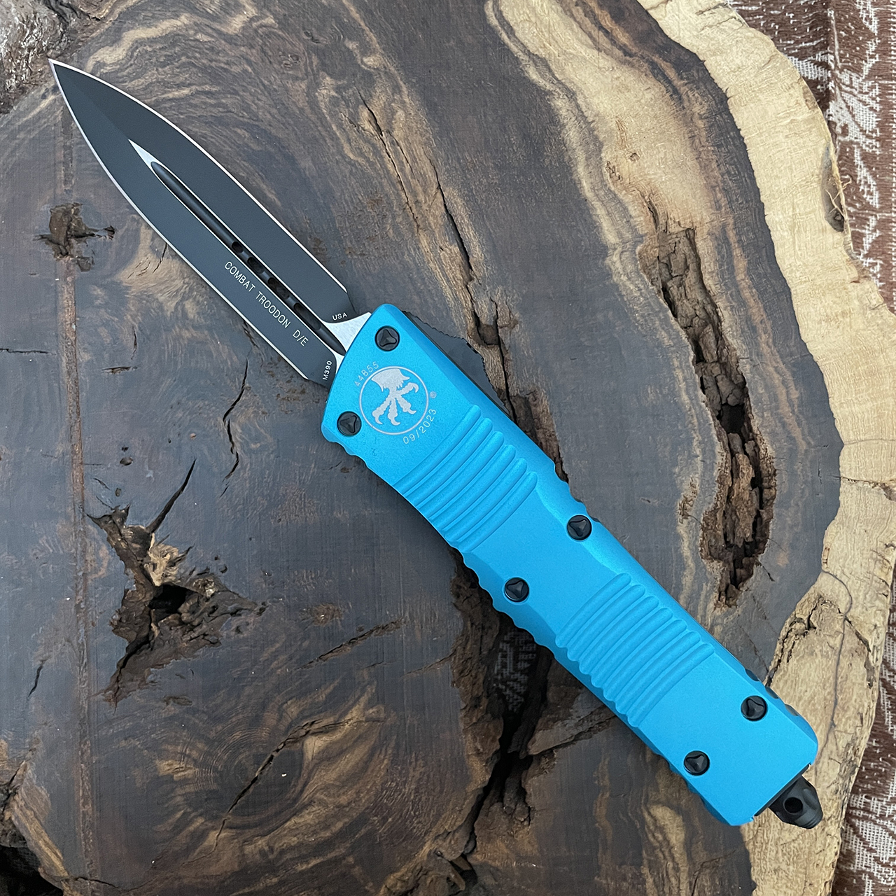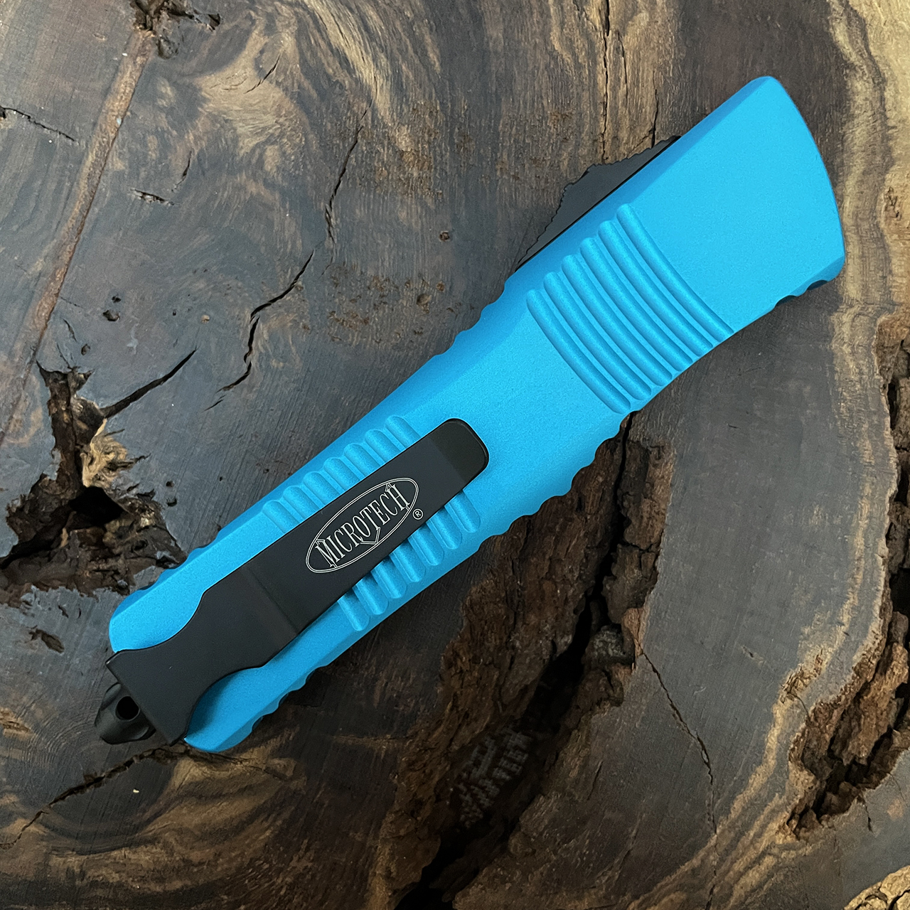 This model features a turquoise anodized 6061-T6 aluminum with grooves and jimping. Black finished M390 stainless steel double edge dagger blade with standard cutting edges. All black finished stainless steel glass breaker, reversible pocket clip, and hardware. The pocket clip features the Microtech logo. The blade has the model information. The handle has the Microtech Claw logo, serial number, and production date on the front. Brand new in box.