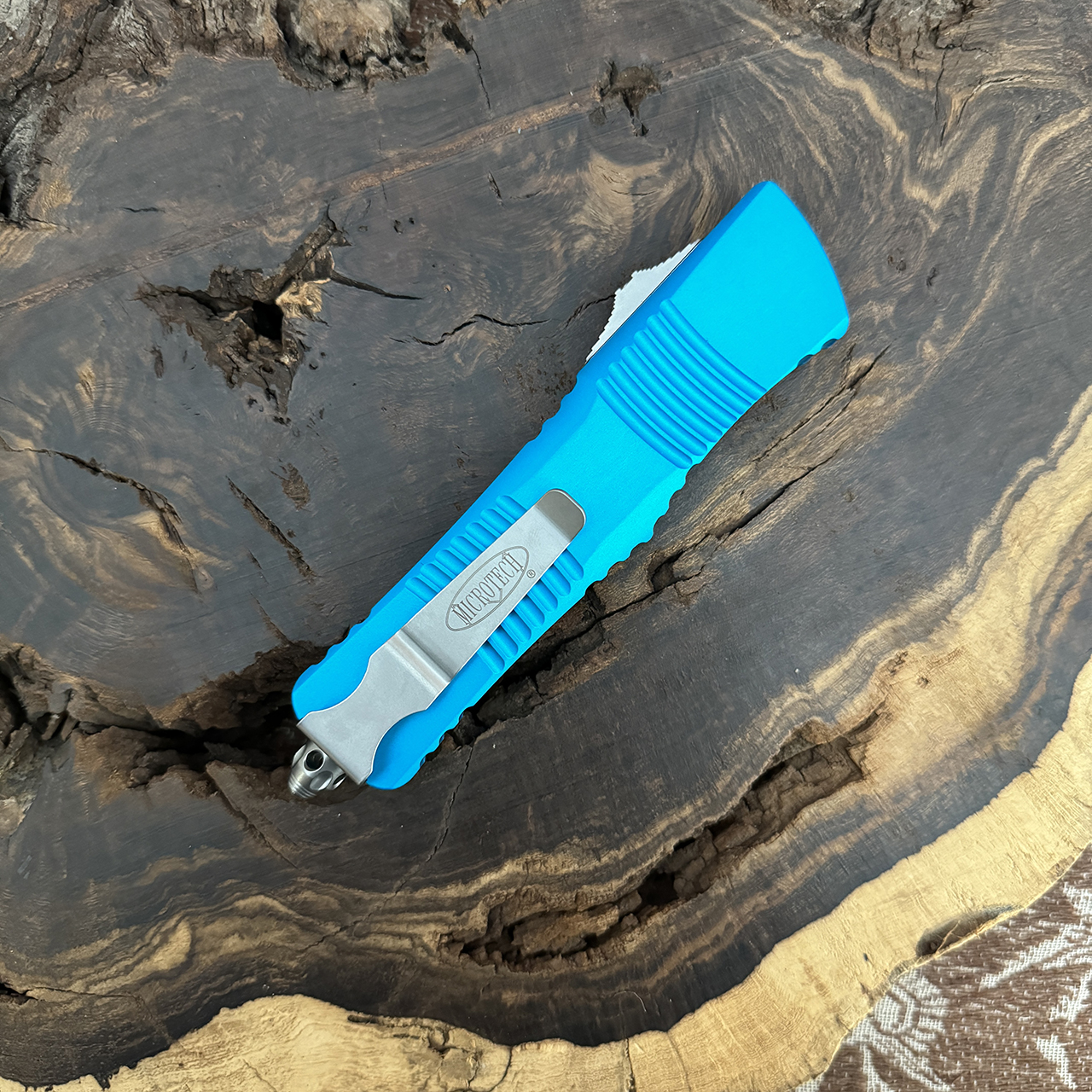 This model features a turquoise anodized 6061-T6 aluminum handle with grooves and jimping for enhanced grip. Stonewash finished M390 stainless steel double edge dagger blade with standard cutting edges. Bead blast finished stainless steel glass breaker, reversible pocket clip, and hardware. The pocket clip features the Microtech logo. The blade has the model information. The handle has the Microtech Claw logo, serial number, and production date. Brand new in box.