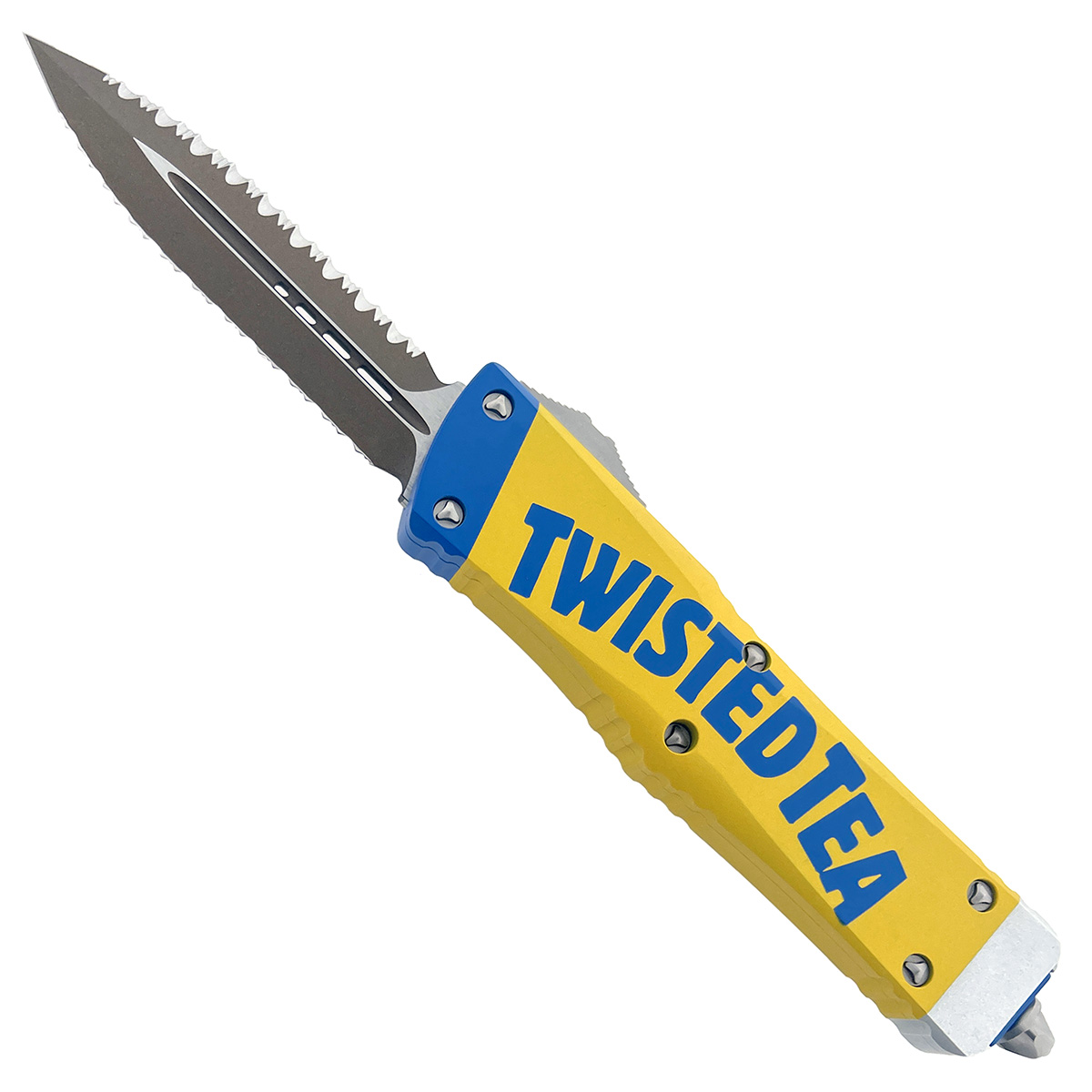 This limited edition signature series model features Twisted Tea themed cerakote finished 6061-T6 aluminum handle scales. Bronze metallic cerakote finished *M390* stainless steel double edge dagger blade with double reverse full serrated cutting edges. Bead blast finished hardware and glass breaker. The pocket clip is marked with the Marfione Dagger logo and MEMENTO MORI (which means remember you must die). One of the coolest and rarest Microtech Combat Troodons made with just 25 of this configuration made. Like new in box, this pre-owned knife is like new box has a little wear.