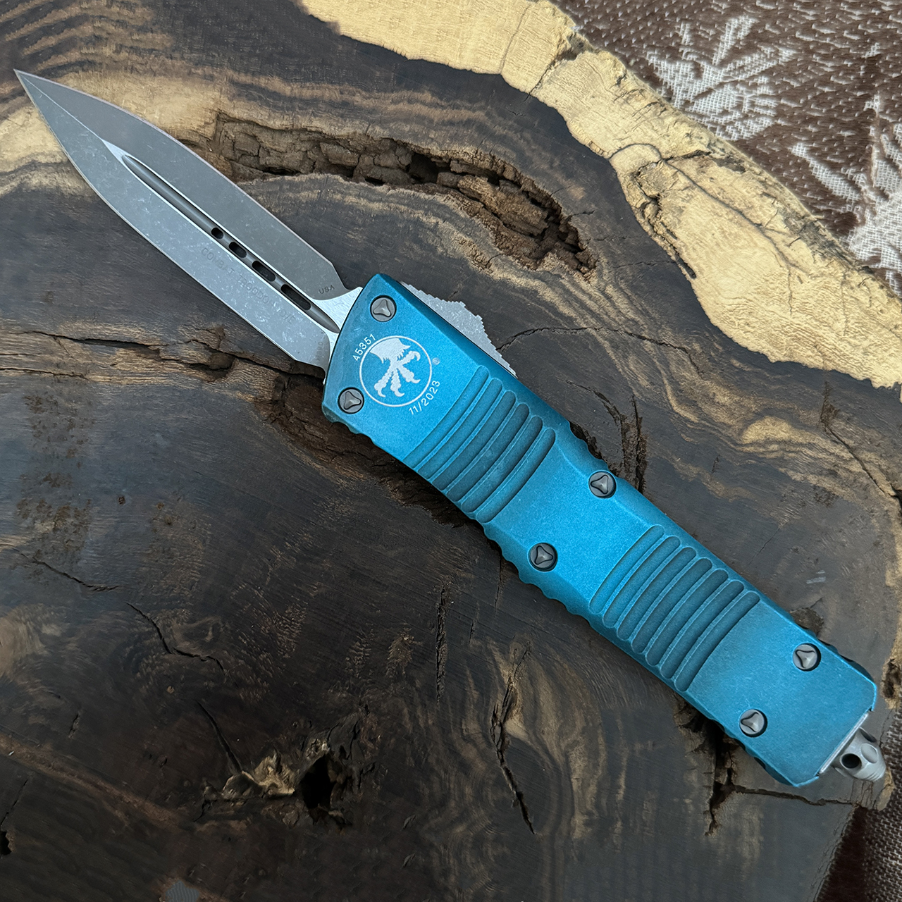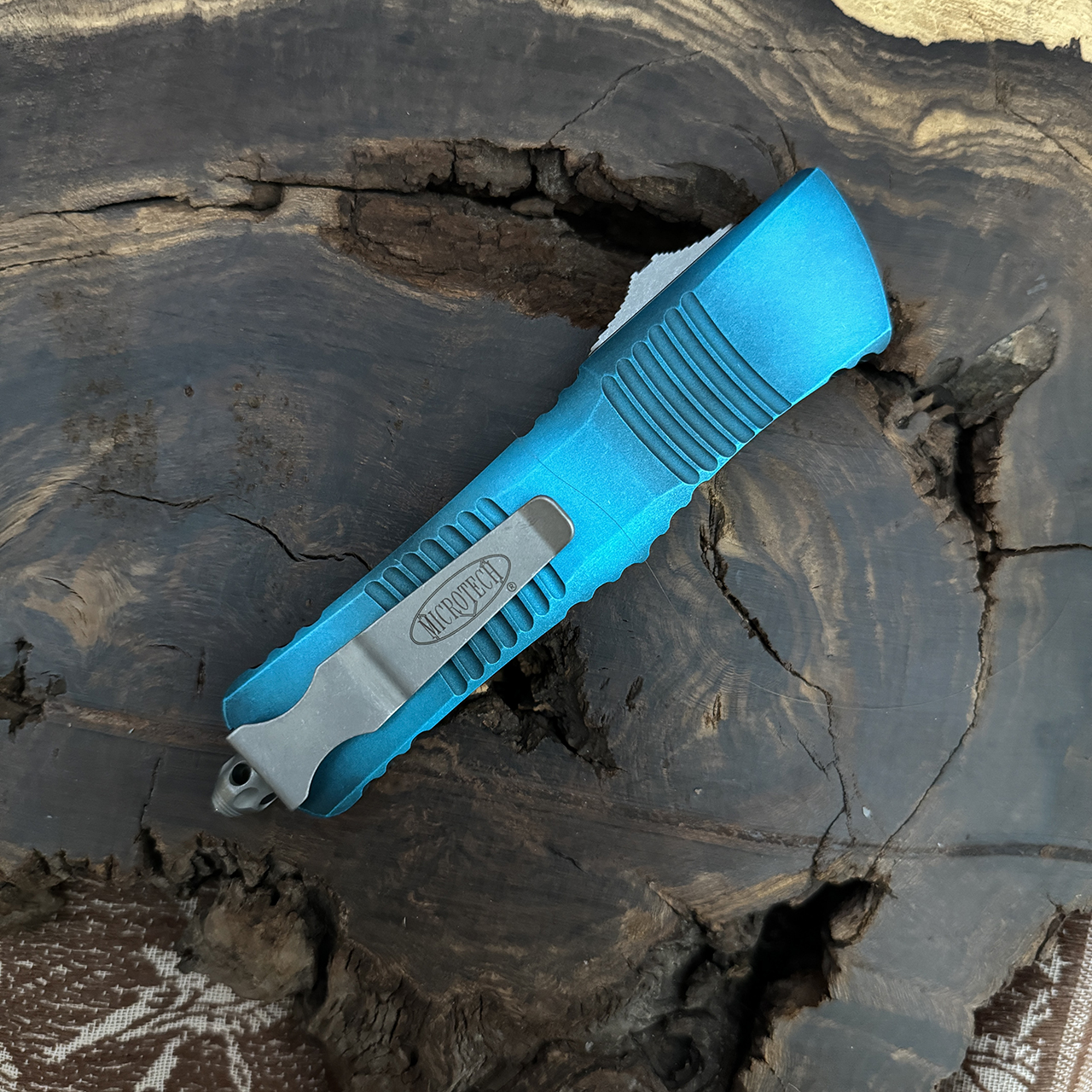 This model features a weathered turquoise anodized 6061-T6 aluminum handle with grooves and jimping for enhanced grip. Apocalyptic finished M390 stainless steel double edge dagger blade with standard cutting edges. Apoclayptic finished stainless steel glass breaker, reversible pocket clip, and hardware. The pocket clip features the Microtech logo. The blade has the model information. The handle has the Microtech Claw logo, serial number, and production date. Brand new in box.