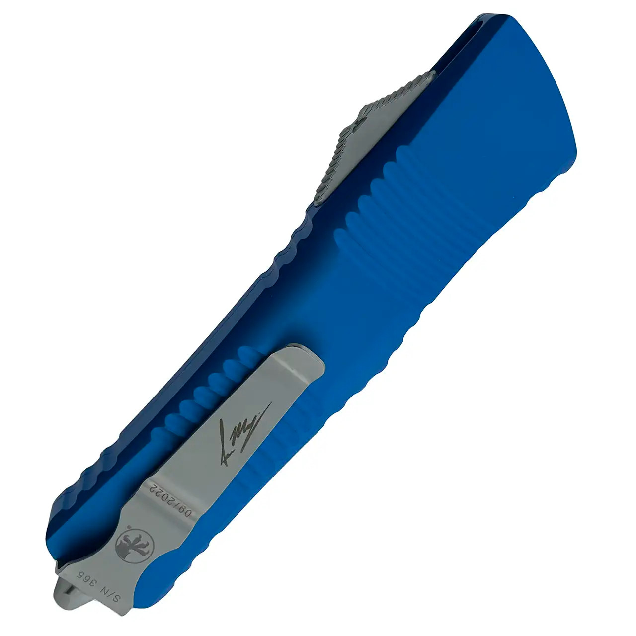 This limited edition Signature Series model features a blue anodized 6061-T6 aluminum with grooves and jimping. Stonewash finished M390 stainless steel Hellhound tanto blade with a standard cutting edge. Bead blast finished stainless steel glass breaker, reversible pocket clip, and hardware. The pocket clip features the Microtech Claw logo, Signature Series logo, and production date. The handle has the Microtech Sean Marfione Dagger logo on the front. Brand new in box.