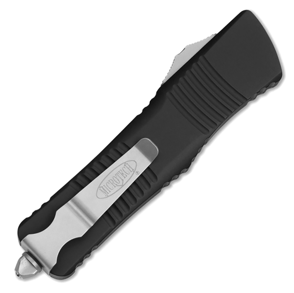 This model features a black anodized 6061-T6 aluminum handle with grooves and jimping for enhanced grip. Apocalyptic finished CTS-204P stainless steel single edge drop point blade with a standard cutting edge. Bead blast finished stainless steel glass breaker, reversible pocket clip, and hardware. The pocket clip features the Microtech logo. The blade has the model information. The handle has the Microtech Claw logo, serial number, and production date. Brand new in box.