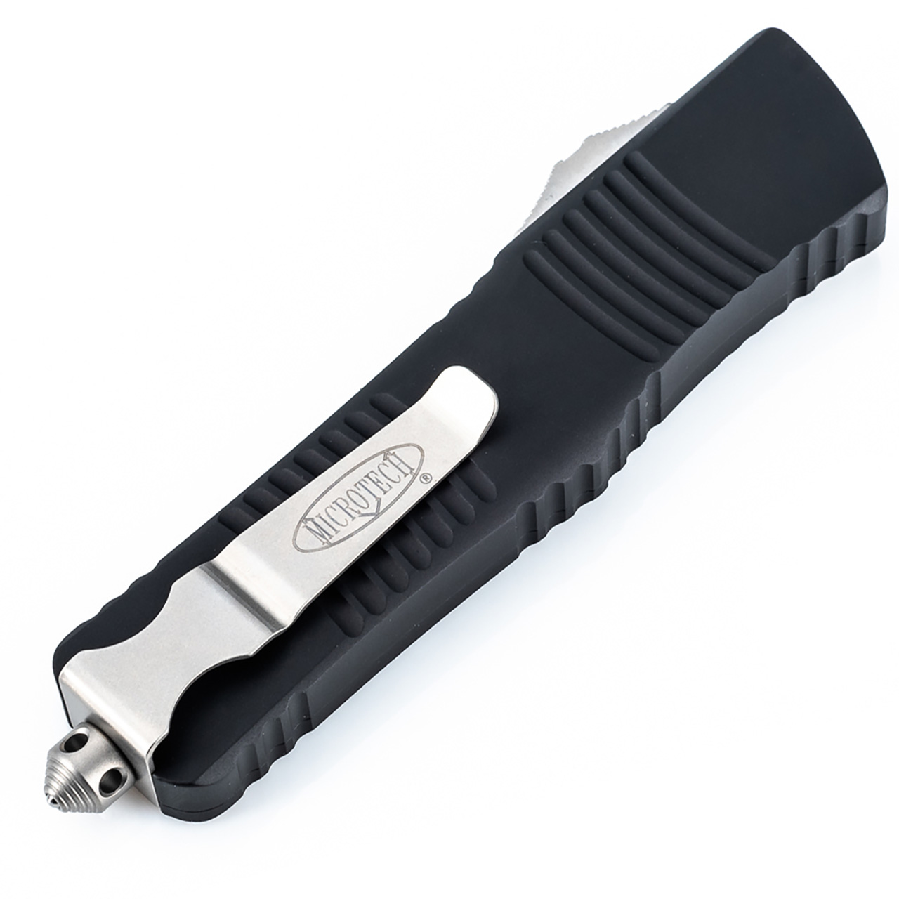 This model features a black anodized 6061-T6 aluminum handle with grooves and jimping for enhanced grip. Stonewash finished M390 stainless steel single edge drop point blade with a partially serrated cutting edge. Bead blast finished stainless steel glass breaker, reversible pocket clip, and hardware. The pocket clip features the Microtech logo. The blade has the model information. The handle has the Microtech Claw logo, serial number, and production date. Brand new in box.
