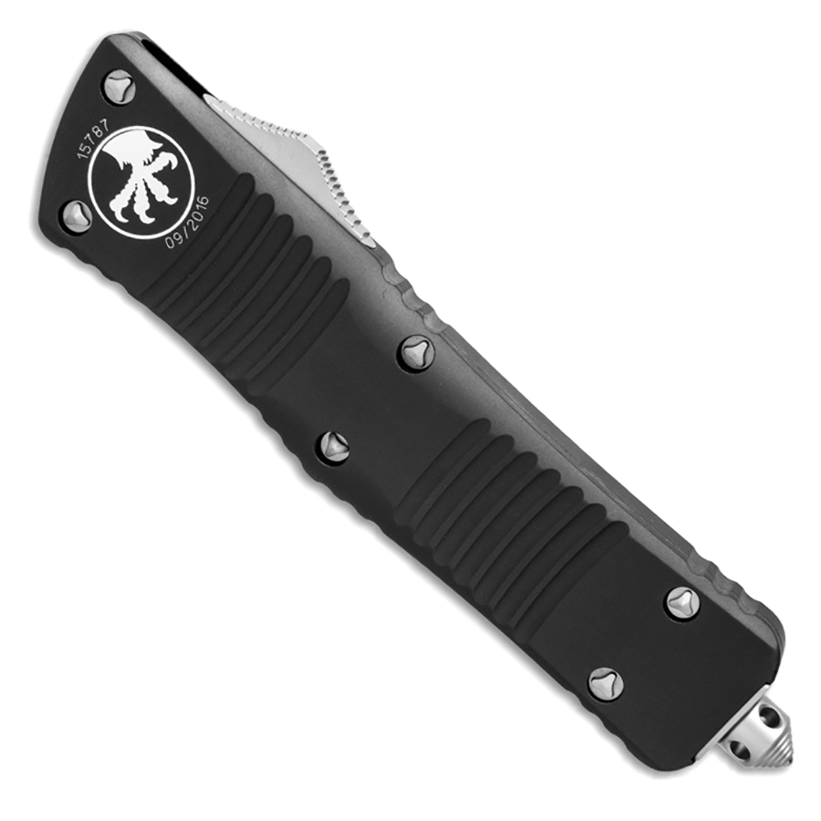 This model features a black anodized 6061-T6 aluminum handle with grooves and jimping for enhanced grip. Black finished ELMAX stainless steel single edge drop point blade with a standard cutting edge. Bead blast finished stainless steel glass breaker, reversible pocket clip, and hardware. The pocket clip features the Microtech logo. The blade has the model information. The handle has the Microtech Claw logo, serial number, and production date. Brand new in box.