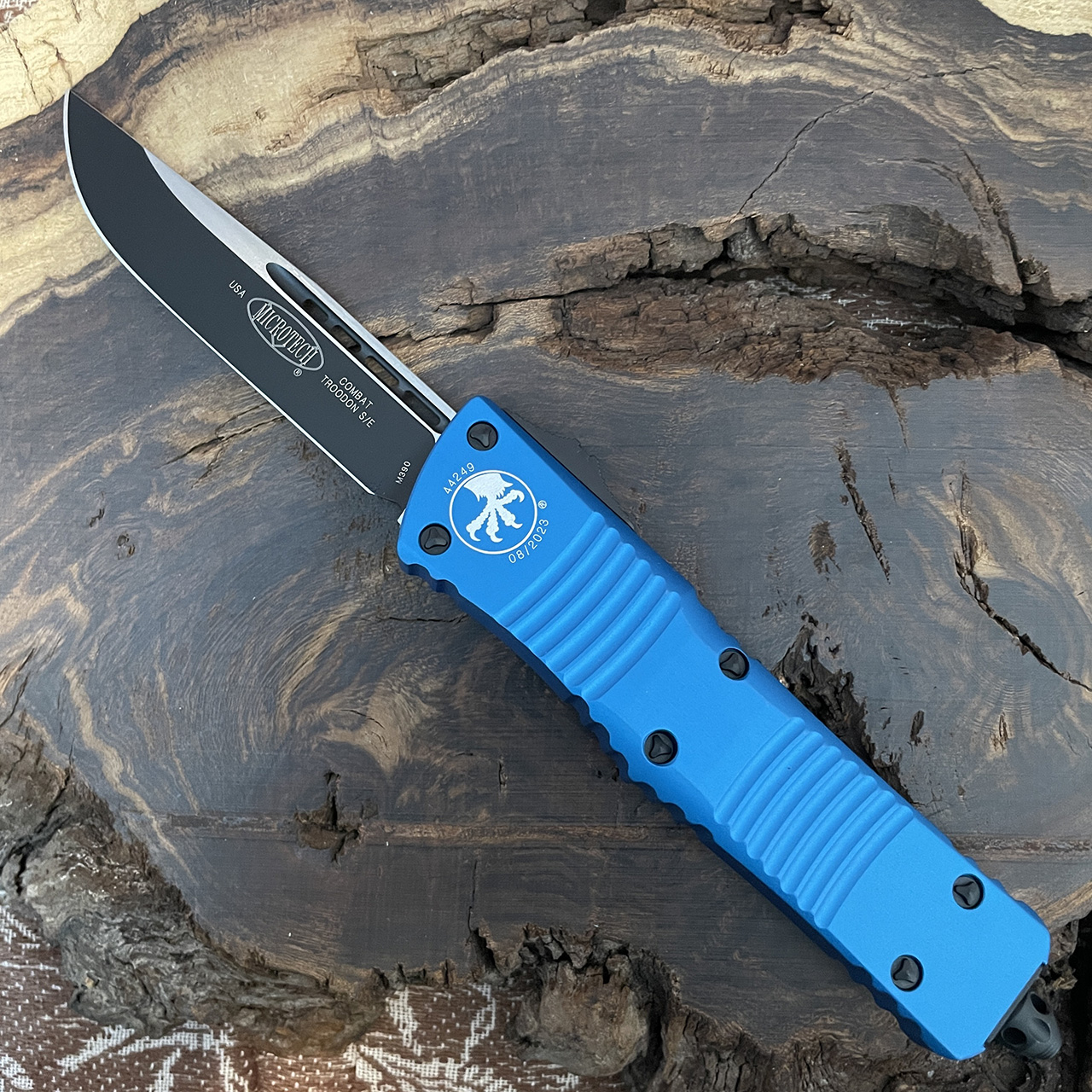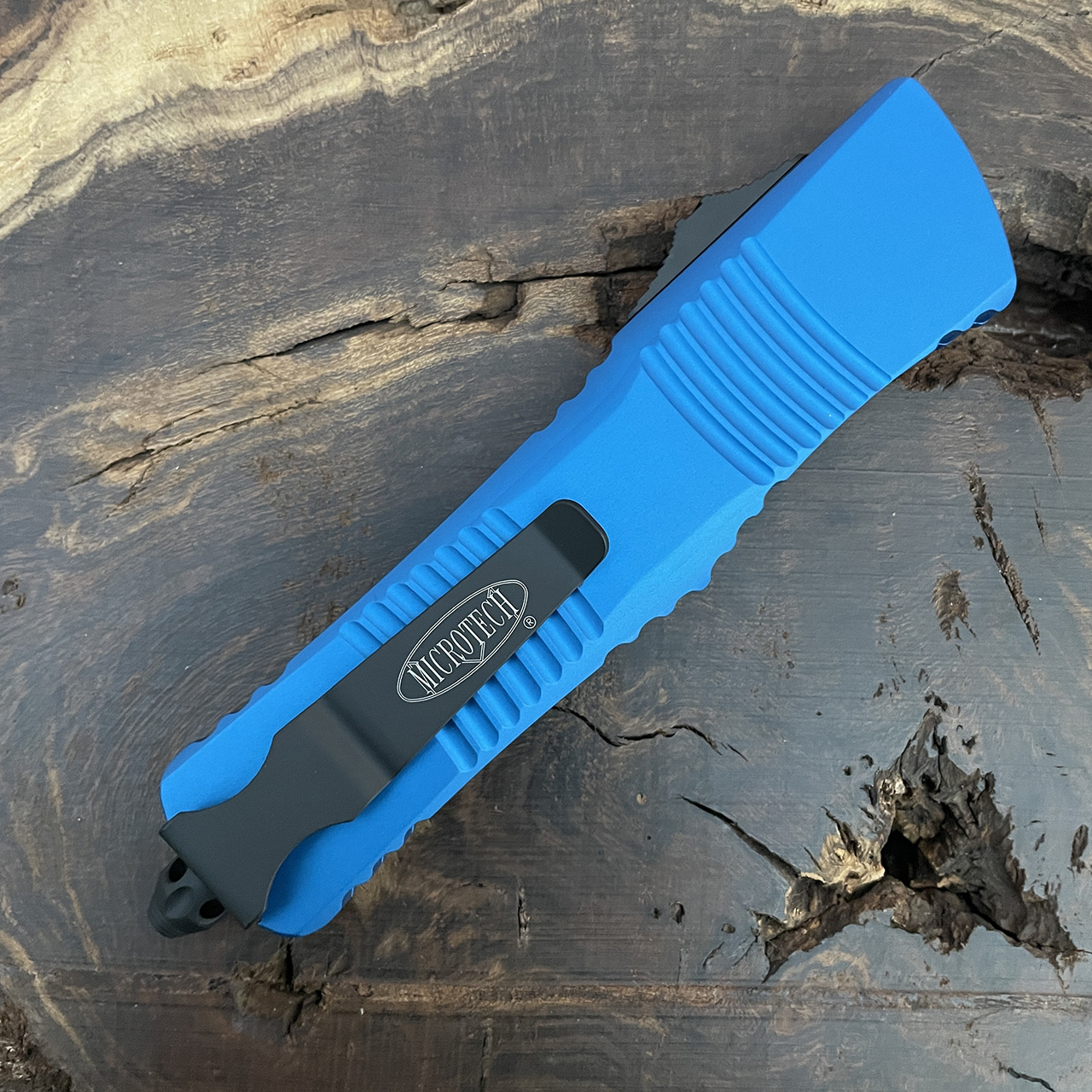 This model features a blue anodized aluminum handle with grooves and jimping for enhanced grip. Black finished M390 stainless steel single edge drop point blade with a standard cutting edge. Black finished stainless steel glass breaker, reversible pocket clip, and hardware. The pocket clip features the Microtech logo. The blade has the model information. The handle has the Microtech Claw logo, serial number, and production date. Brand new in box.