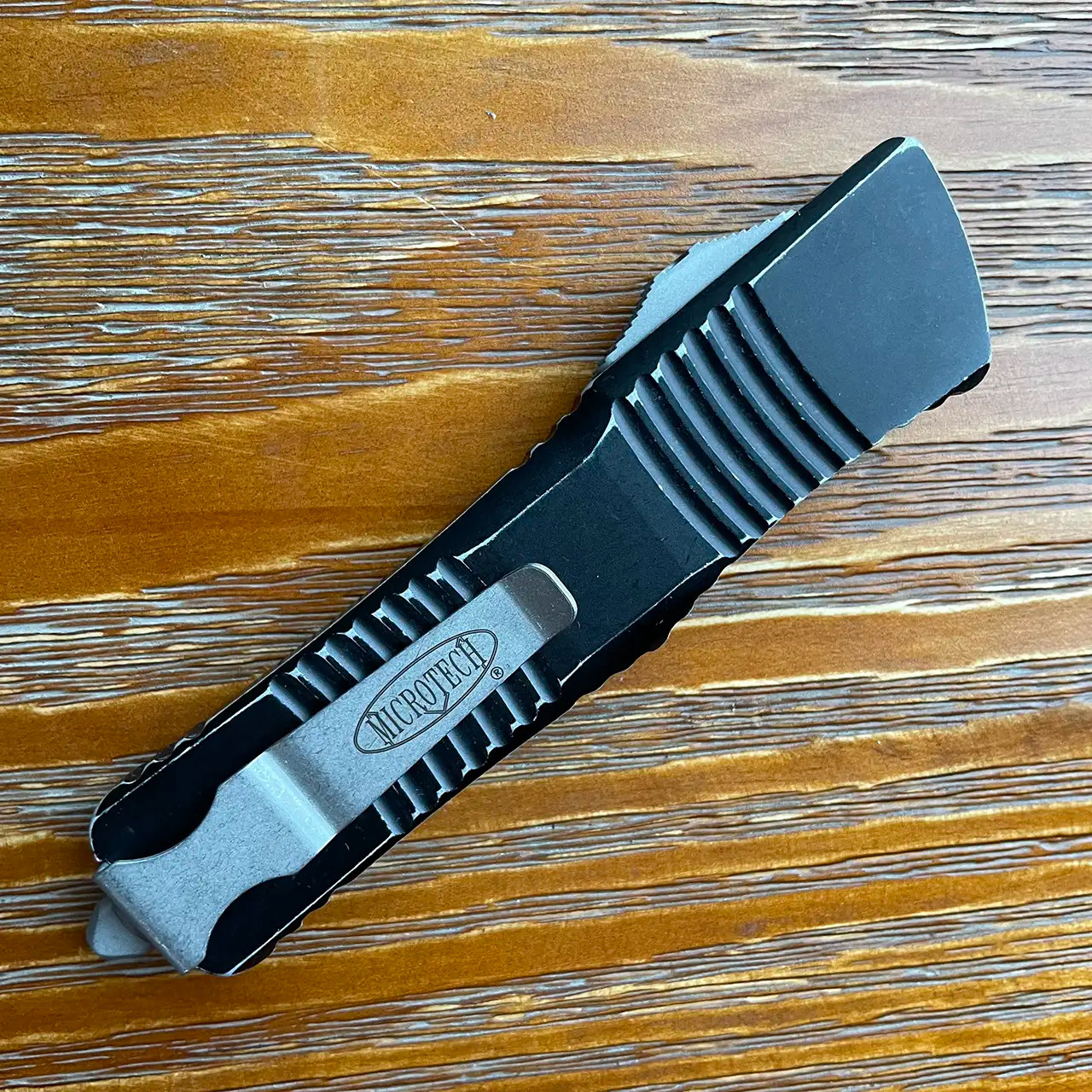 This model features a distressed black anodized 6061-T6 aluminum handle with grooves and jimping for enhanced grip. Apocalyptic finished M390 stainless steel single edge drop point blade with a standard cutting edge. Apocalyptic finished stainless steel glass breaker, reversible pocket clip, and hardware. The pocket clip features the Microtech logo. The blade has the model information. The handle has the Microtech Claw logo, serial number, and production date. Brand new in box.