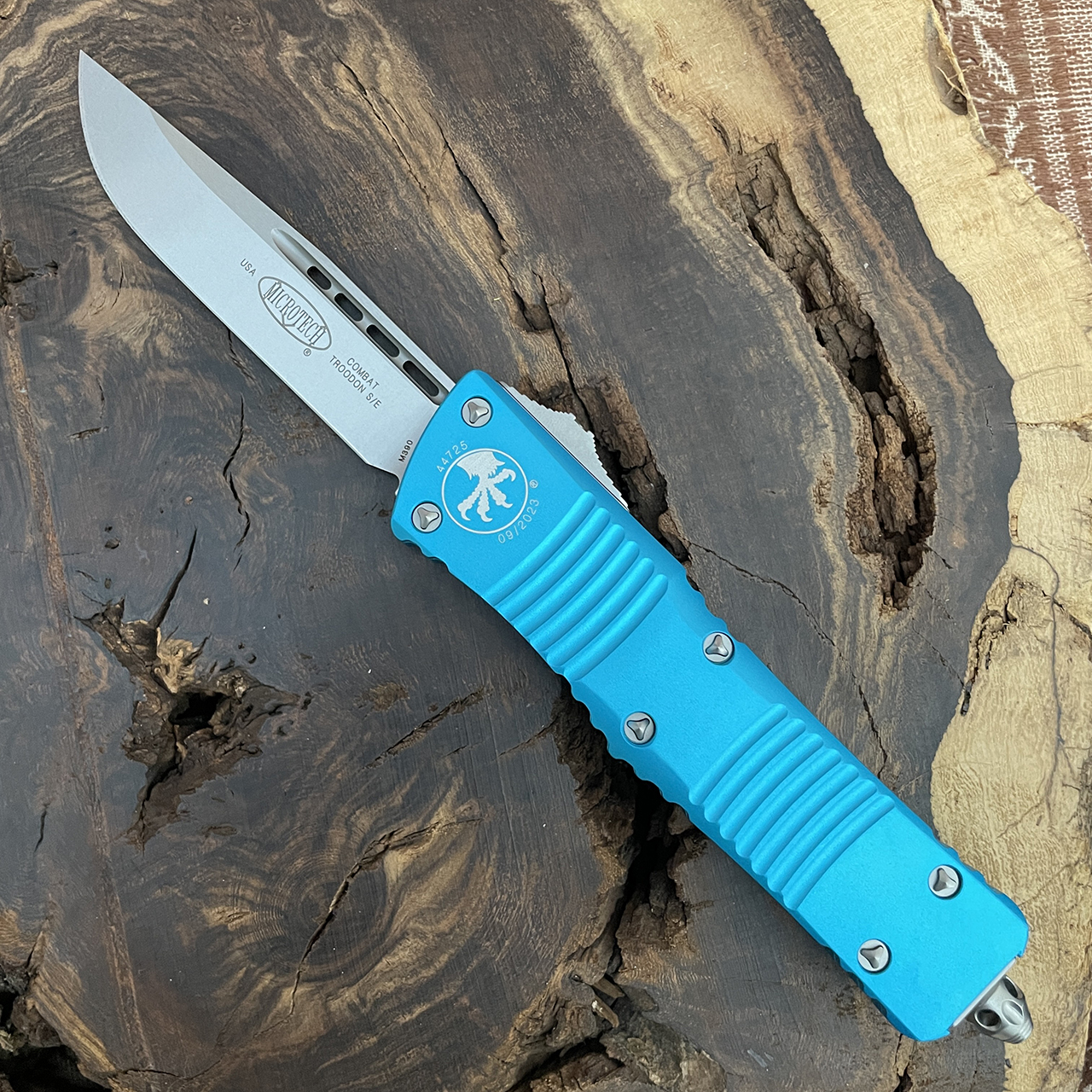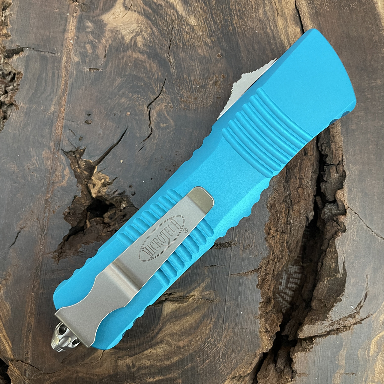 This model features a turquoise anodized 6061-T6 aluminum handle with grooves and jimping for enhanced grip. Stonewash finished M390 stainless steel single edge drop point blade with a standard cutting edge. Bead blast finished stainless steel glass breaker, reversible pocket clip, and hardware. The pocket clip features the Microtech logo. The blade has the model information. The handle has the Microtech Claw logo, serial number, and production date. Brand new in box.
