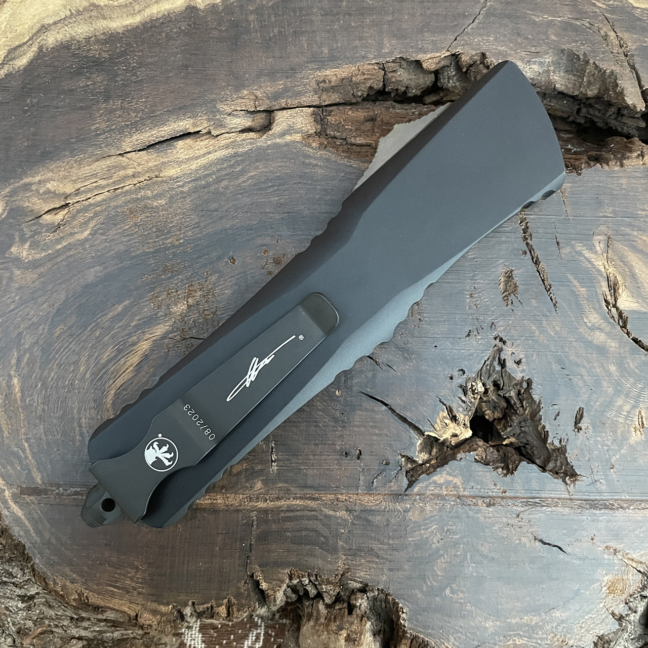 This model features a black anodized 6061-T6 aluminum handle with ultem top and button. DLC finished Magnacut stainless steel single edge drop point blade with a standard cutting edge. DLC finished stainless steel glass breaker, reversible pocket clip, and hardware. The pocket clip features the Microtech claw, Signature Series logo, and production date. Brand new in box.