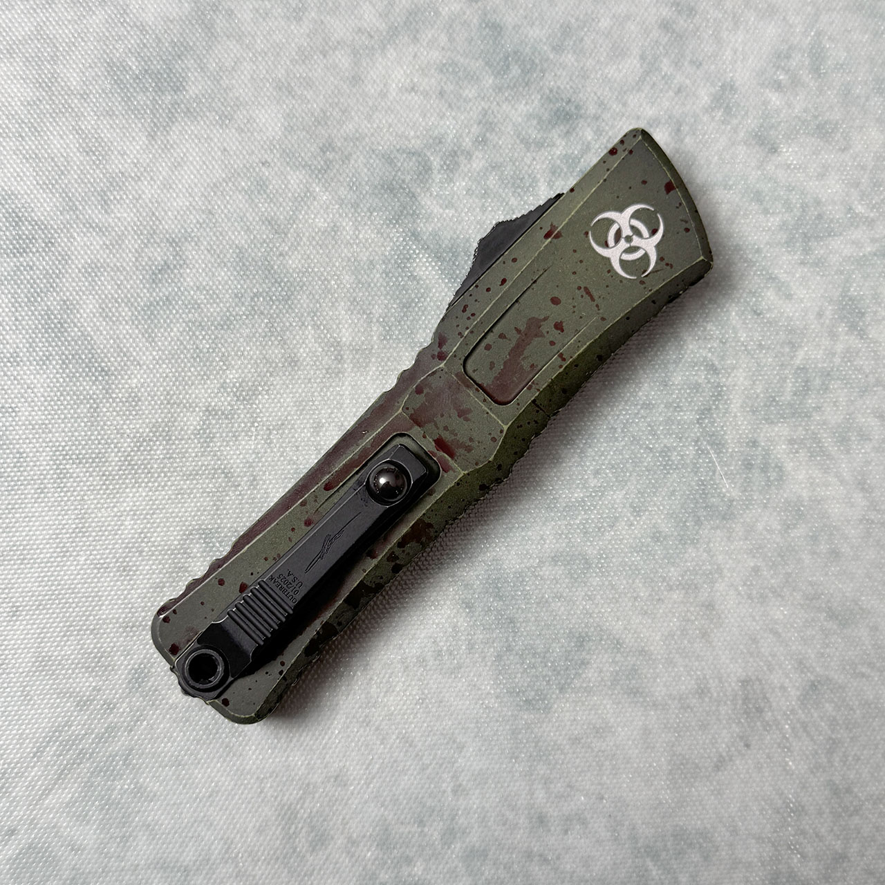 This model features a outbreak themed handle with Torx. Outbreak finished M390MK stainless steel tanto blade with full serrated cutting edge. Reversible titanium roller ball pocket clip. Brand new in box.