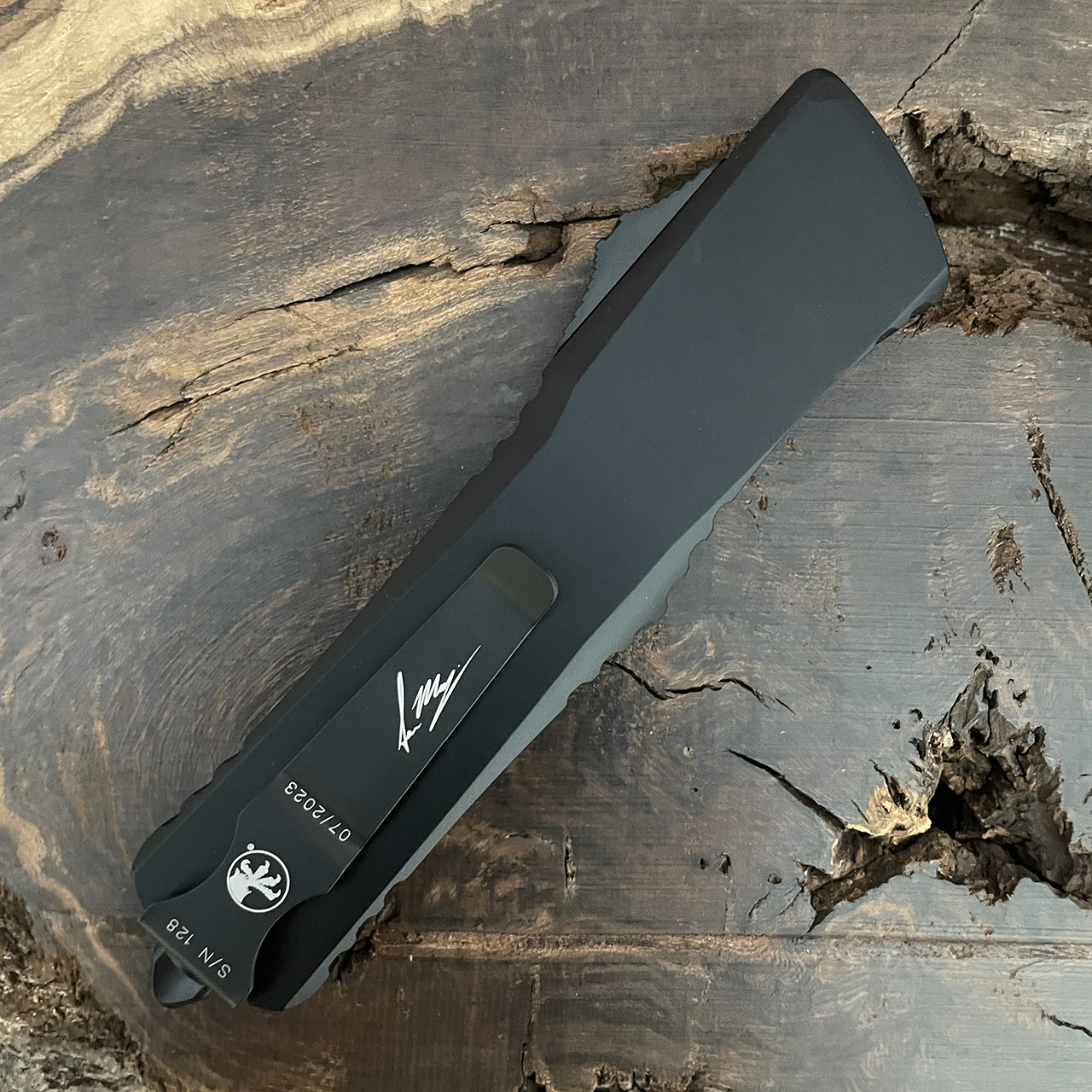 This limited edition Signature Series model features a black anodized smooth chassis 6061-T6 aluminum with grooves and jimping. Black finished M390 stainless steel Warhound wharncliffe blade. Black tactical finished stainless steel glass breaker, reversible pocket clip, and hardware. These have an updated wider button and slightly different pattern that makes deployment a little easier. The pocket clip features the Microtech Claw logo, Sean Marfione Signature Series logo, serial number, and production date. The handle has the Microtech Sean Marfione Dagger logo on the front. Brand new in box.