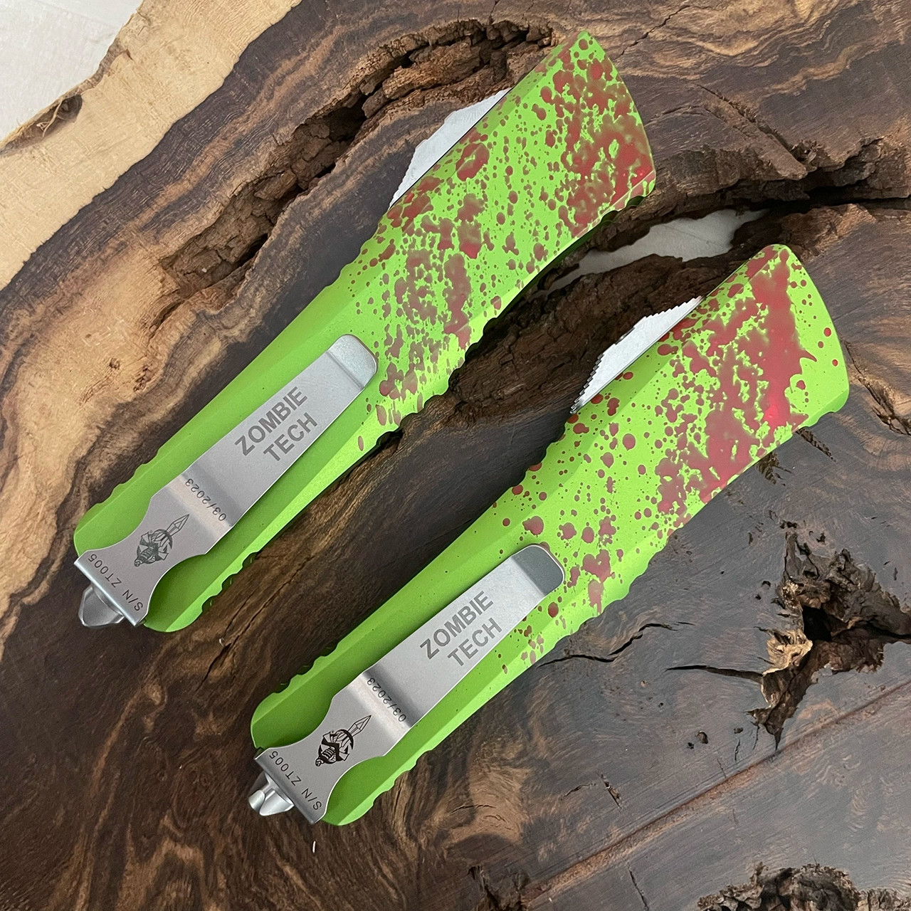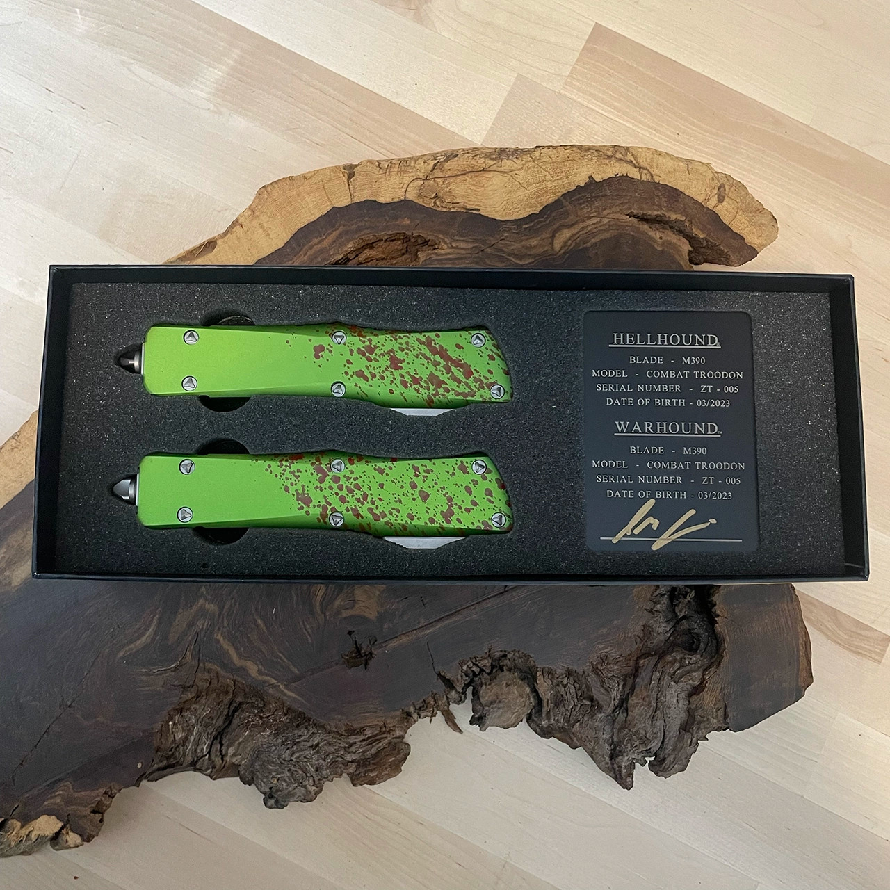 This signature series set features two matching knives with zombie green anodized 6061-T6 aluminum handle scales with random red "blood" spatter. Stonewash finished M390 stainless steel. Stonewash finished M390 stainless steel warhound and hellhound blades. Beadblast finished hardware, reversible pocket clip, lanyard hole, and glass breaker. This Zombie set features the Signature logo and Zombie Tech on the pocket clip as well as the production date and serial number. This is a matching serial number set. Brand new in box with COA plate.