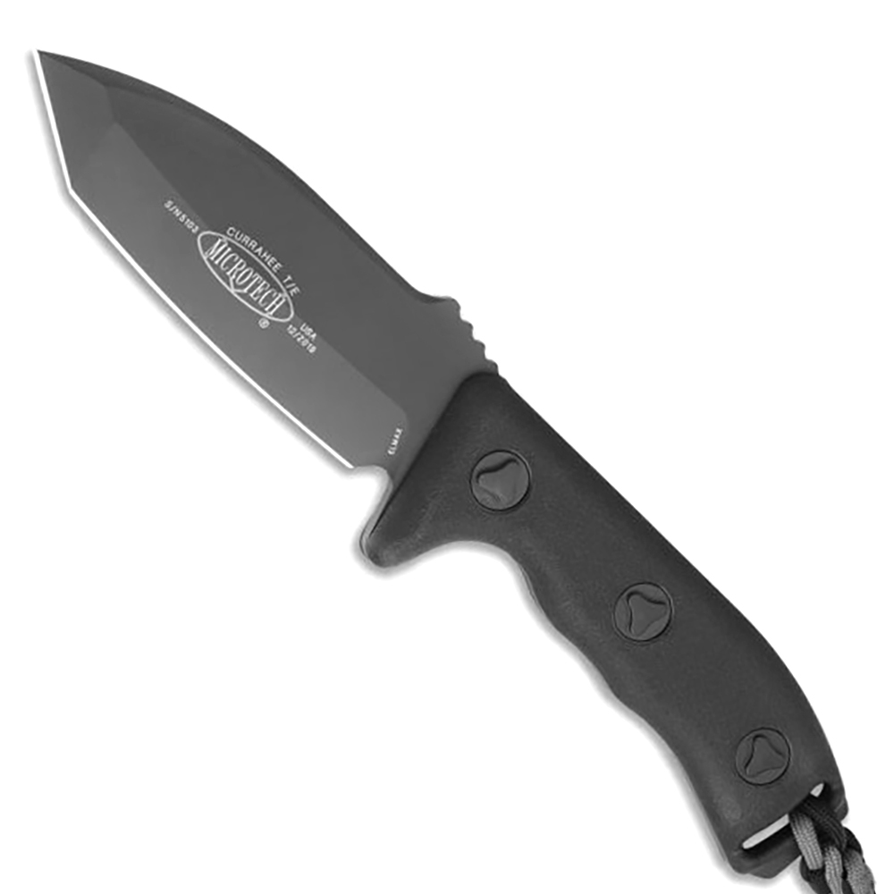 This model features black composite polymer handle. Black finished ELMAX stainless steel tanto blade. Black finished stainless steel Tri Wing hardware. Lanyard loop with lanyard and heavy knocker bead. The blade is etched with the Microtech logo, model information, serial number, and production date. Brand new in box.