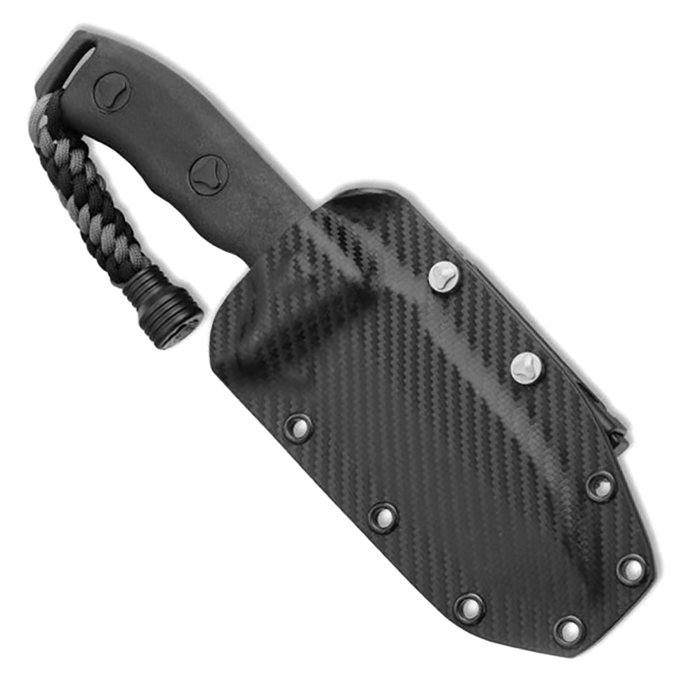 The Microtech Currahee fixed blade was designed years ago for the U.S. Special Forces Boat Team 20. Currahee is a Cherokee name, which translates to "stands alone" and is also the name of the last mountain in the Blue Ridge range. It was there that the US Army established Camp Toccoa during WWII and where the first Parachute Infantry was trained. These knives are built like tanks with a full tang construction from thick stock. Large raised jimping on the spine. The textured composite polymer handle provides a secure and comfortable grip. Includes a MOLLE compatible carbon fiber wrapped kydex sheath.