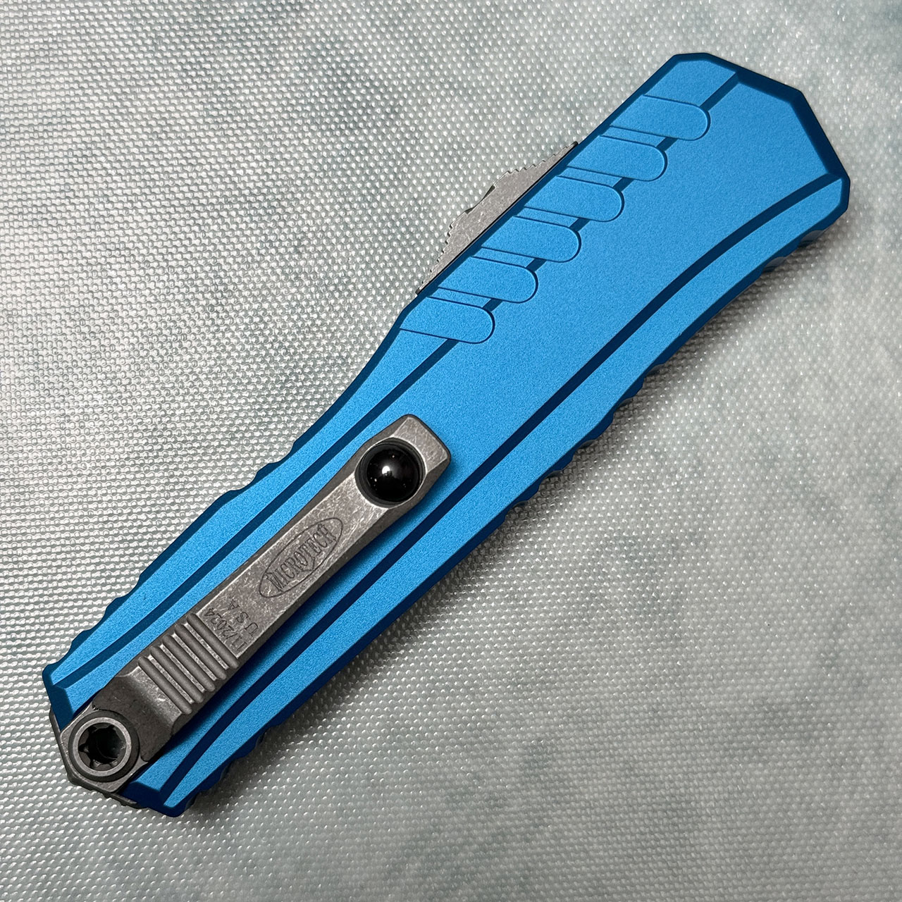 This model features a blue anodized 6061-T6 aluminum handle. Apoclayptic finished M390MK stainless steel double edge dagger blade. Apocalyptic finished glass breaker, pocket clip, thumb slide, and lanyard hole. The blade has the Microtech claw logo and model information. Brand new in box.