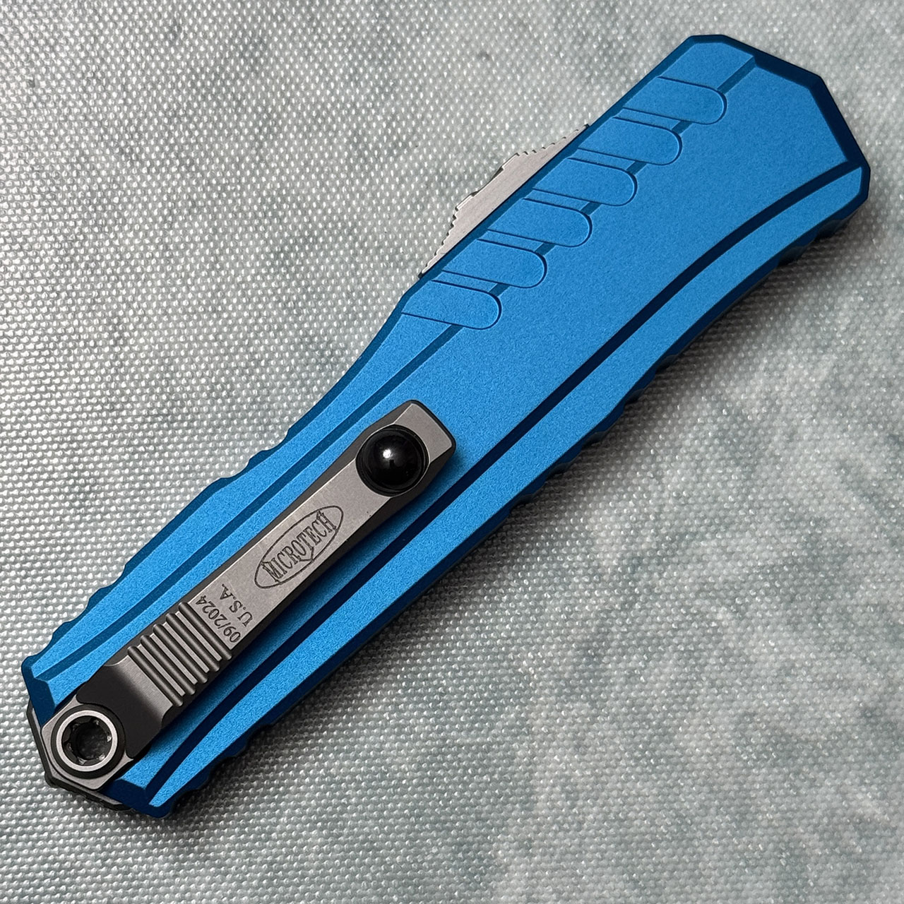 This model features a blue anodized 6061-T6 aluminum handle. Stonewash finished M390MK stainless steel full serrated double edge dagger blade. Bead blast finished glass breaker, pocket clip, thumb slide, and lanyard hole. The blade has the Microtech claw logo and model information. Brand new in box.
