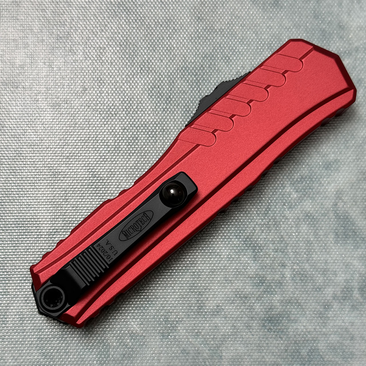 This model features a red 6061-T6 aluminum handle. Black finished M390MK stainless steel double edge full serrated dagger blade. Black finished glass breaker, pocket clip, thumb slide, and lanyard hole. The blade has the Microtech claw logo and model information. Brand new in box.