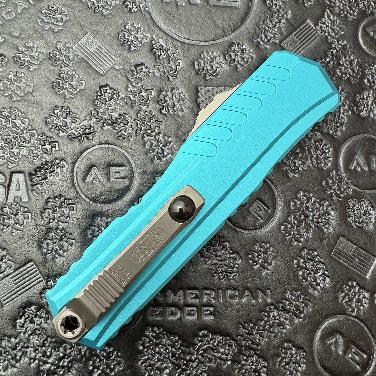 This model features a turquoise anodized 6061-T6 aluminum handle. Stonewash finished M390MK stainless steel double edge dagger blade. Bead blast finished glass breaker, pocket clipn thumb slide, and lanyard hole. The blade has the Microtech claw logo and model information. Brand new in box.