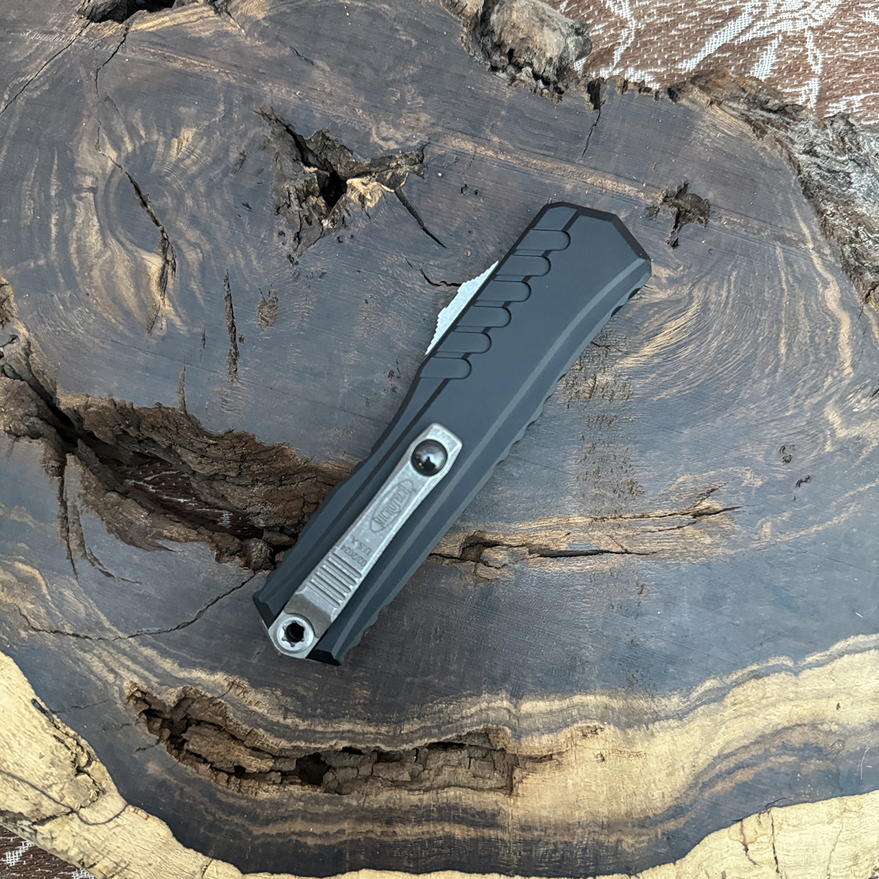 This model features a black anodized 6061-T6 aluminum handle. Apocalyptic finished M390MK stainless steel single edge drop point blade. Apoclayptic finished glass breaker, pocket clipn thumb slide, and lanyard hole. The blade has the Microtech claw logo and model information. Brand new in box.