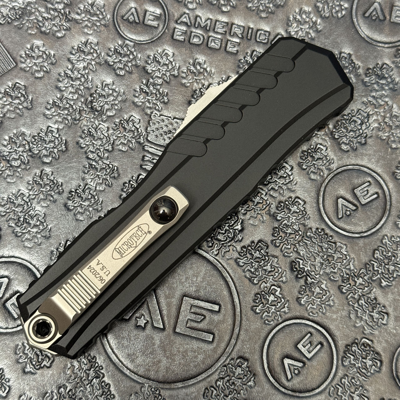 This model features a black anodized 6061-T6 aluminum handle. Stonewash finished M390MK stainless steel single edge partially serrated drop point blade. Bead Blast finished glass breaker, pocket clip, thumb slide, and lanyard hole. The blade has the Microtech claw logo and model information. Brand new in box.