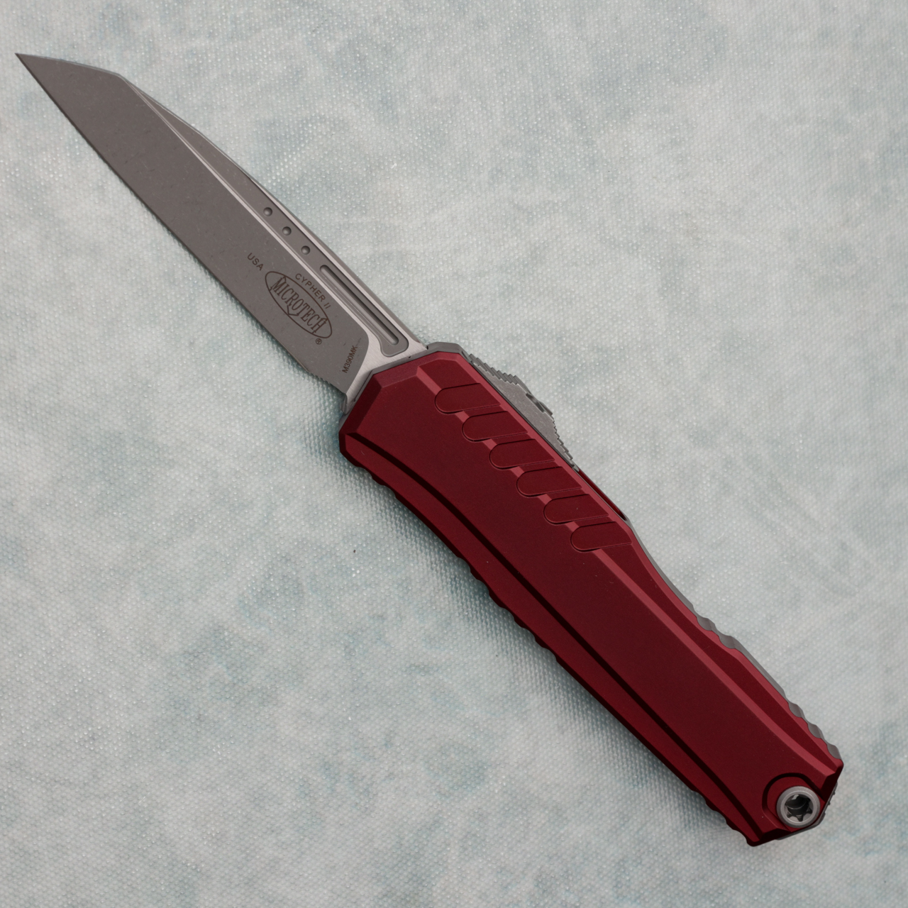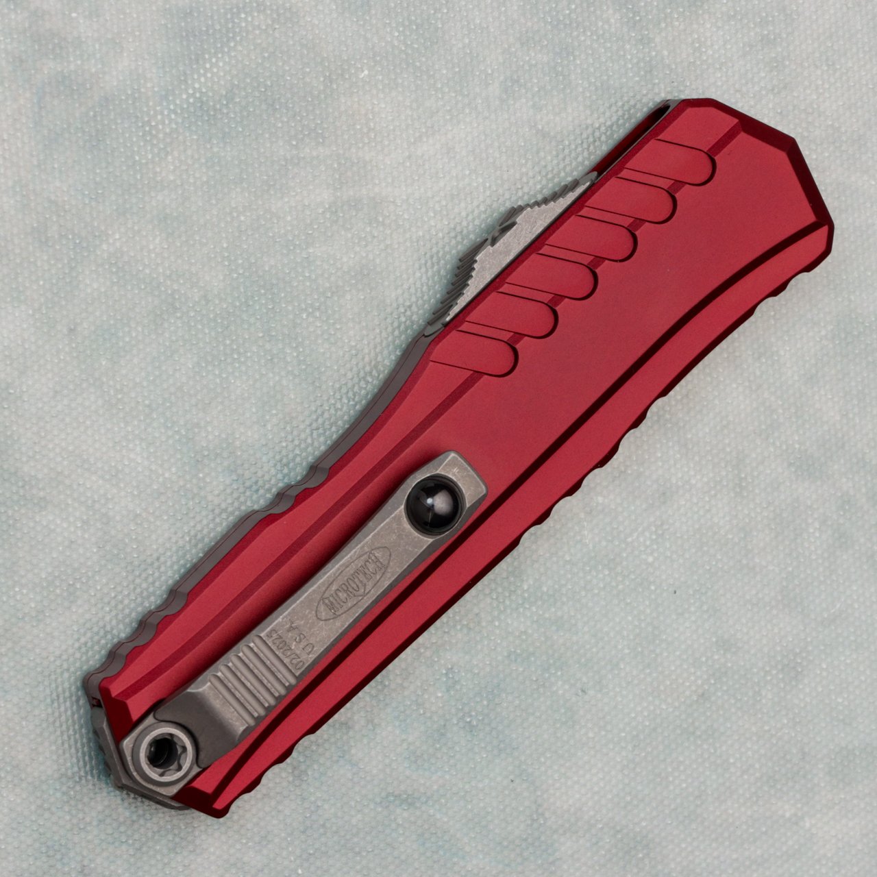 This model features a merlot anodized 6061-T6 aluminum handle. Apocalyptic finished M390MK stainless steel single edge drop point blade. Bead blast finished glass breaker, pocket clip, thumb slide, and lanyard hole. The blade has the Microtech claw logo and model information. Brand new in box.