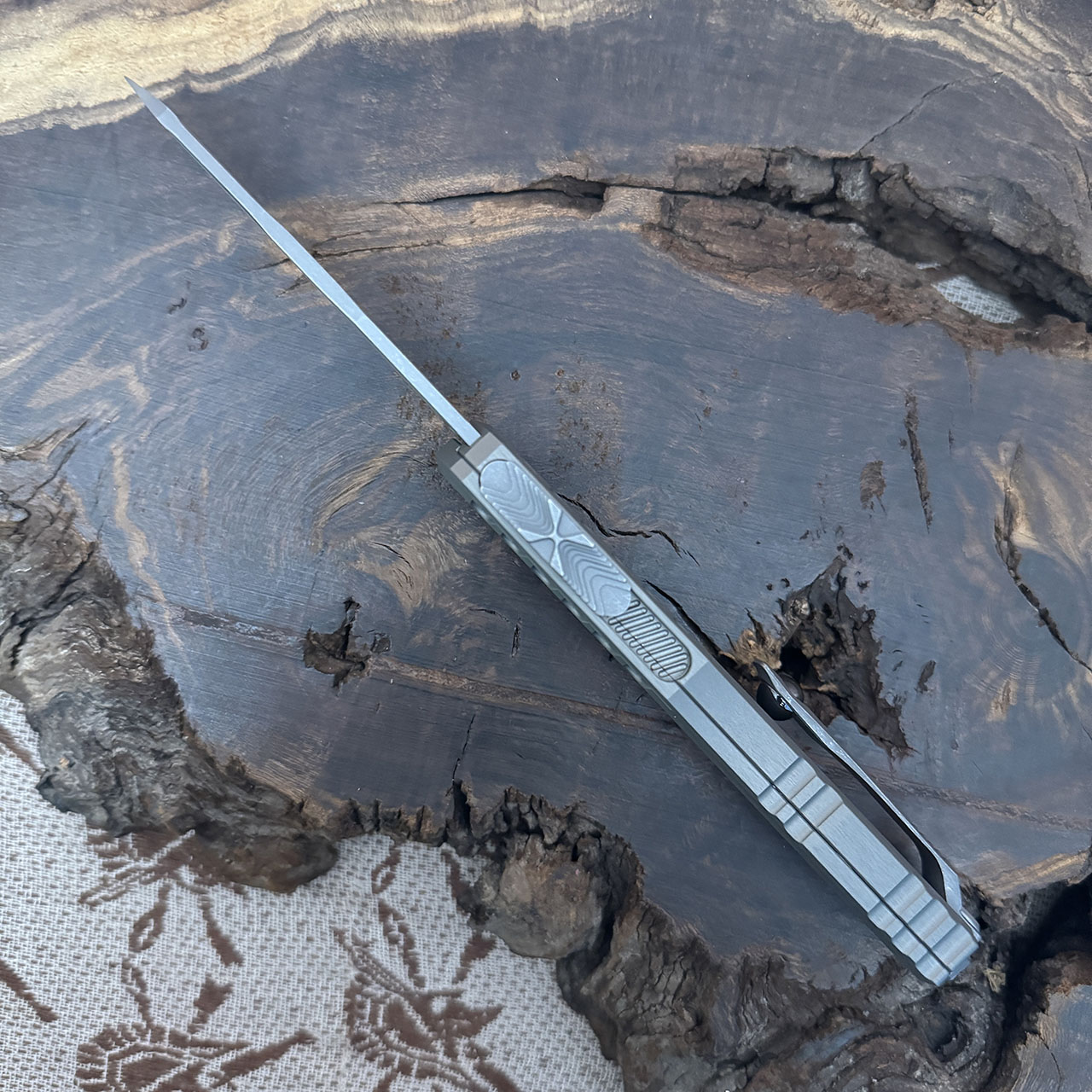 This model features a natural clear anodized 6061-T6 aluminum handle. Apocalyptic finished M390MK stainless steel single edge partially serrated drop point blade. Apocalyptic finished glass breaker, pocket clip, thumb slide, and lanyard hole. The blade has the Microtech claw logo and model information. Brand new in box.