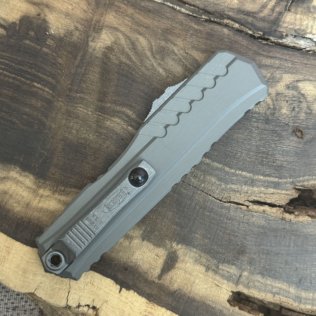 This model features a natural clear anodized 6061-T6 aluminum handle. Apocalyptic finished M390MK stainless steel single edge drop point blade. Apocalyptic finished glass breaker, pocket clipn thumb slide, and lanyard hole. The blade has the Microtech claw logo and model information. Brand new in box.