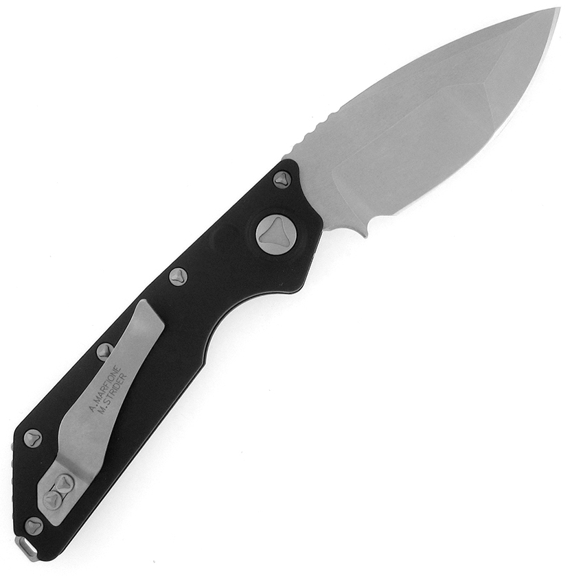 The Microtech D.O.C. Killswitch is an automatic folder from Microtech that harnesses the design genius of Anthony Marfione and Mick Strider. It features a black anodized 6061-T6 aluminum handle with traction inserts and a titanium sub-lock tab for solid lockup. The blade is a spear point style with unique bevels that put more steel at the tip. This knife opens automatically using the Killswitch lock/button and feels comfortable in grip with an index choil below and jimping up top. The blade is marked Death On Contact along with the serial number and date. This model features a satin finished blade with a plain edge. The hardware and pocket clip are bead blast finished. Brand new in box. No pre-order here these are fresh in stock and ready to ship!