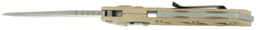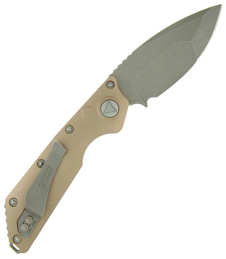 The Microtech D.O.C. Killswitch is an automatic folder from Microtech that harnesses the design genius of Anthony Marfione and Mick Strider. It features a desert tan anodized 6061-T6 aluminum handle with traction inserts and a titanium sub-lock tab for solid lockup. The blade is a spear point style with unique bevels that put more steel at the tip. This knife opens automatically using the Killswitch lock/button and feels comfortable in grip with an index choil below and jimping up top. The blade is marked D.O.C. along with the serial number and date. This special edition model features an Apocalyptic finished blade with a plain edge. The hardware and pocket clip are the same special Apocalyptic finish. Brand new in box.