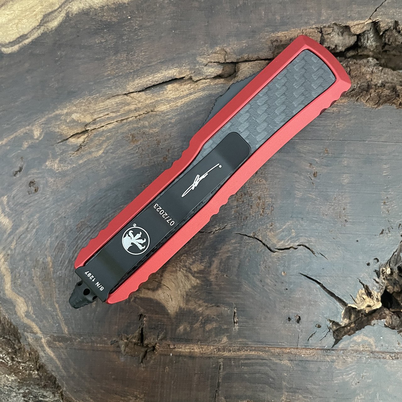 Microtech Daytona D/E Carbon Fiber Inlay Red Handle Black Full Serrated Blade Signature Series 126-3RDCFIS