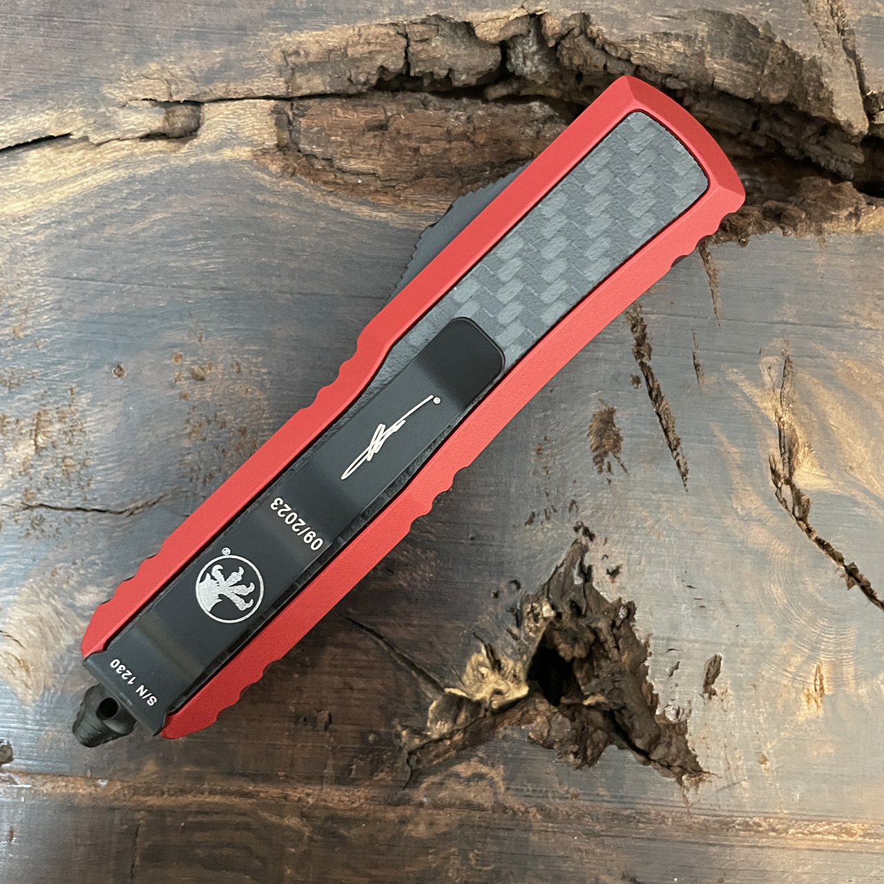 This Signature Series model features red aluminum handle with carbon fiber inlay. Black finished M390 stainless steel single edge drop point blade with standard cutting edge. Black finished hardware, pocket clip, and glass breaker tip. The blade has the Microtech logo and model information. The pocket clip has the Microtech logo, Signature Series logo, serial number, and production date. Brand new in box.