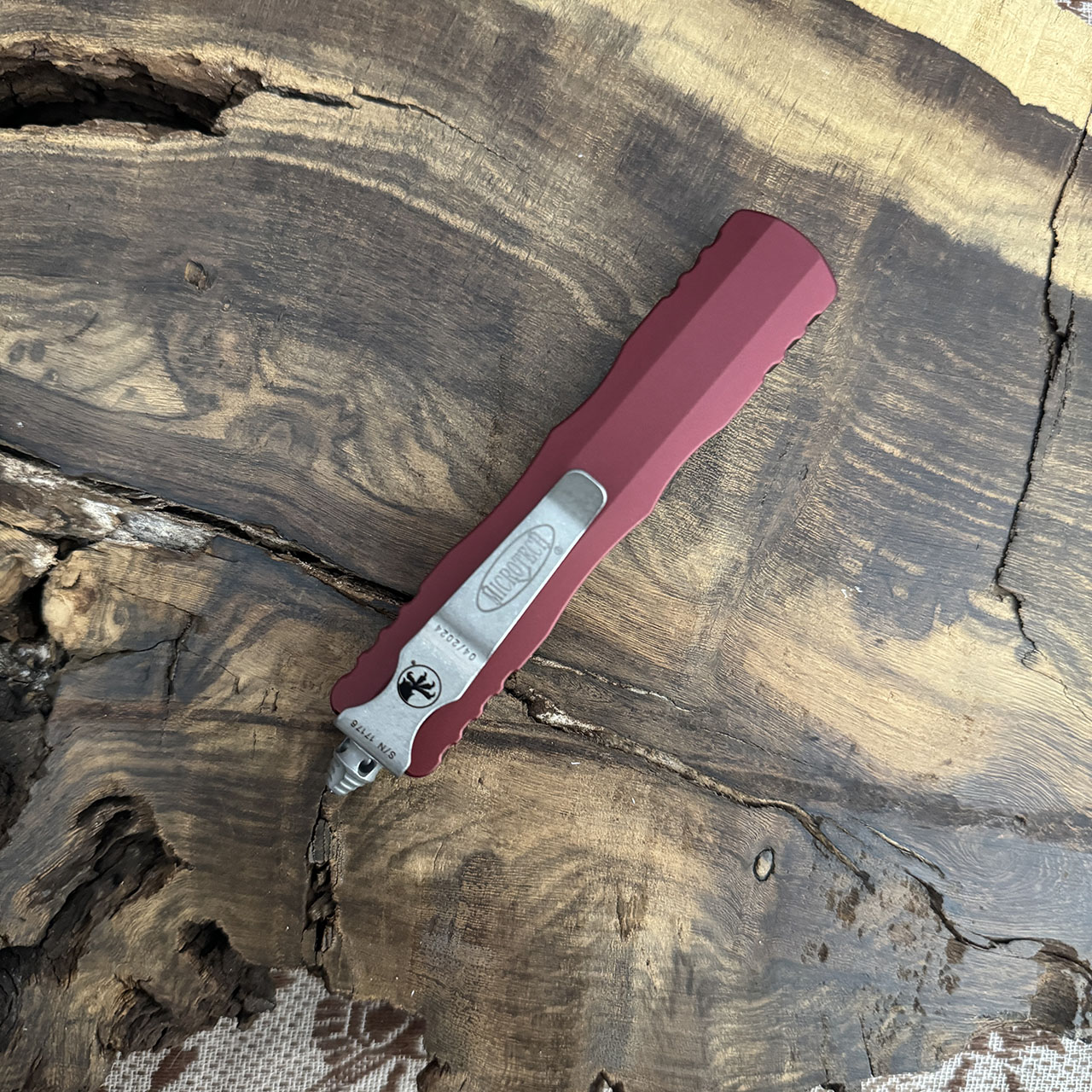 This model features merlot anodized 6061-T6 aluminum handle scales. Apocalyptic finished M390 stainless steel double edge dagger blade. Apocalyptic finished hardware, pocket clip, and glass breaker tip. The blade has the model information. The pocket clip has the Microtech logo, Claw logo, serial number, and production date. Brand new in box.