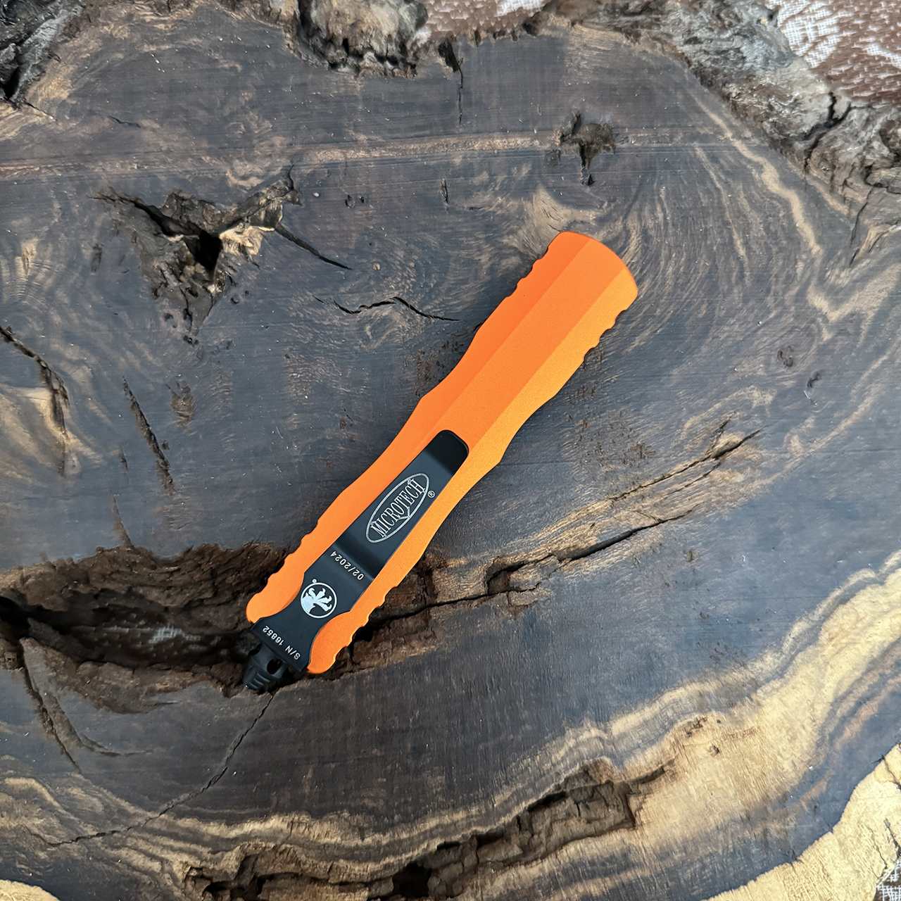 This model features orange anodized aluminum handle scales. Black finished M390 stainless steel double edge dagger blade. Black finished hardware, pocket clip, and glass breaker tip. The blade has the model information. The pocket clip has the Microtech logo, Claw logo, serial number, and production date. Brand new in box.