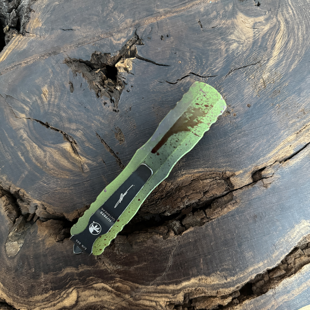 This Signature Series model features an Outbreak themed aluminum handle . It features the Outbreak symbol odeep engraved on the front. Cerakote finished M390 stainless steel double edge dagger blade with a standard cutting edge. Lanyard hole with nylon lanyard. Apocalyptic black finished hardware and finished pocket clip. The clip features the Microtech logo, Siganture Series logo, serial number, model information, and production date. Brand new in box.
