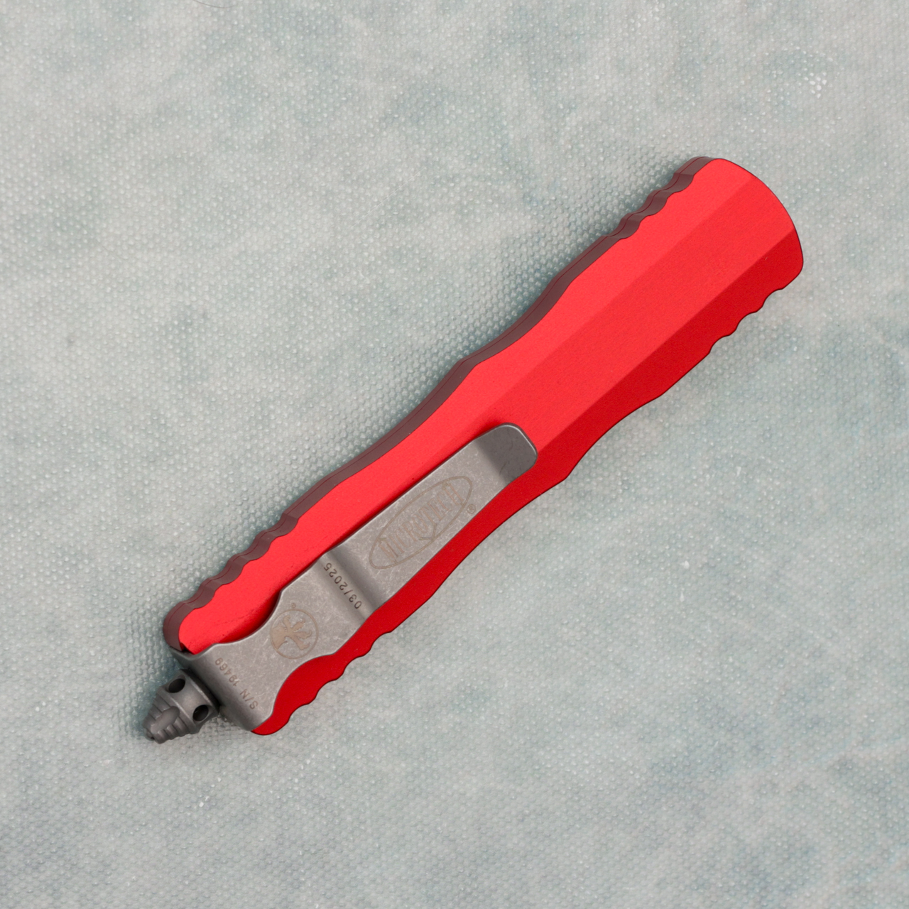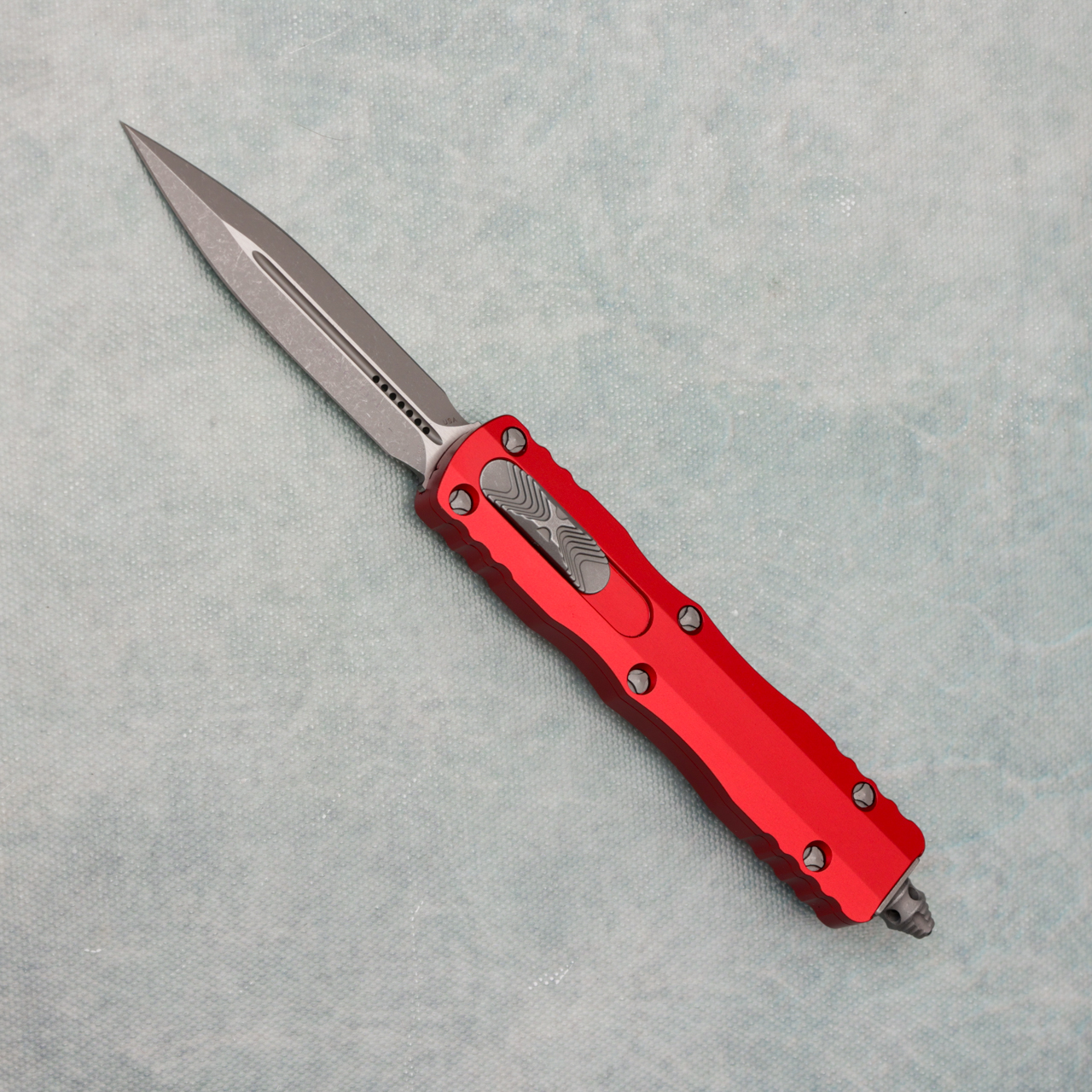 This model features red anodized 6061-T6 aluminum handle scales. Apocalyptic finished M390 stainless steel double edge dagger blade. Apocalyptic finished hardware, pocket clip, and glass breaker tip. The blade has the model information. The pocket clip has the Microtech logo, Claw logo, serial number, and production date. Brand new in box.