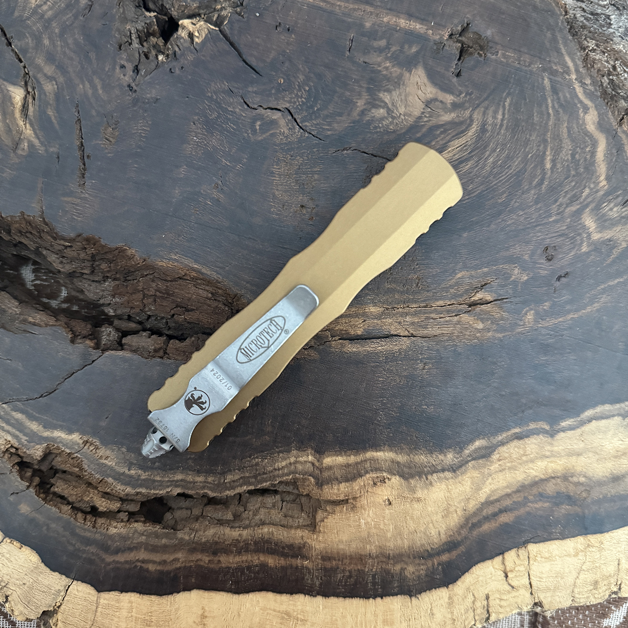 This model features tan anodized 6061-T6 aluminum handle scales. Apocalyptic finished M390 stainless steel double edge dagger blade. Apocalyptic finished hardware, pocket clip, and glass breaker tip. The blade has the model information. The pocket clip has the Microtech logo, Claw logo, serial number, and production date. Brand new in box.