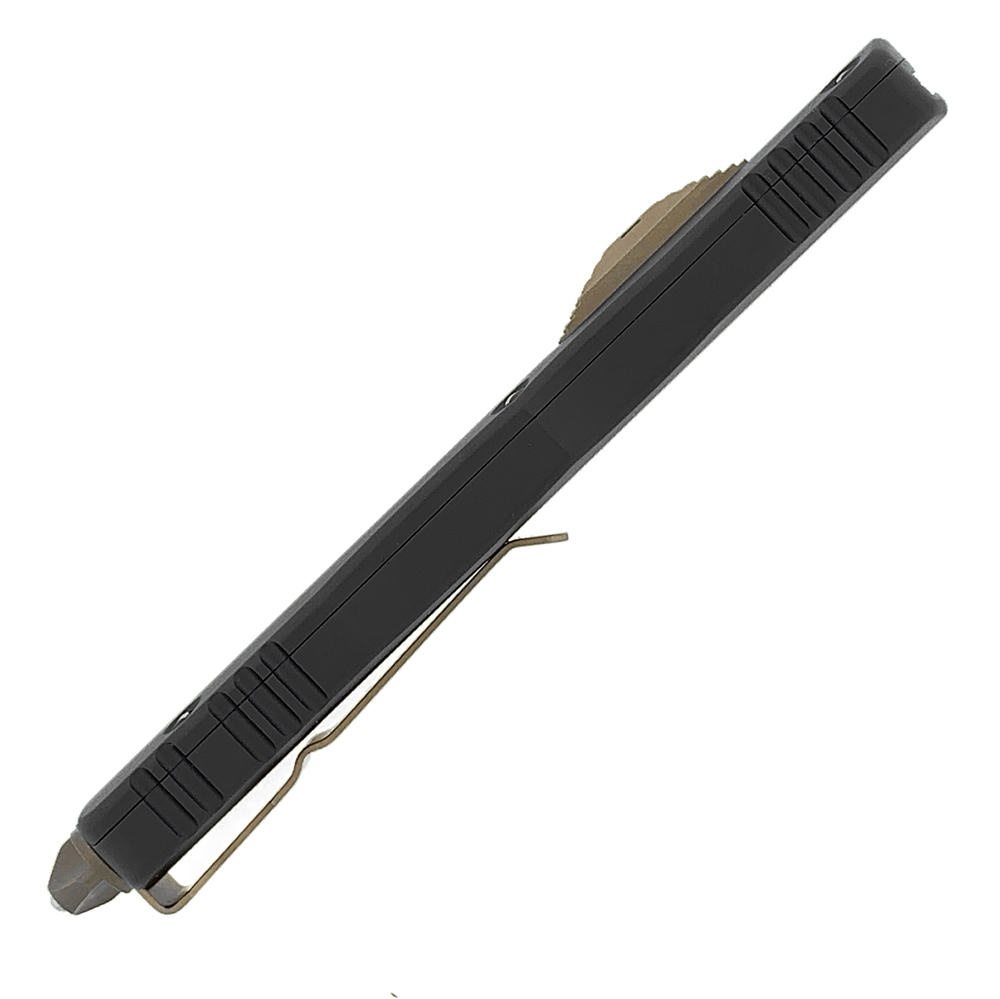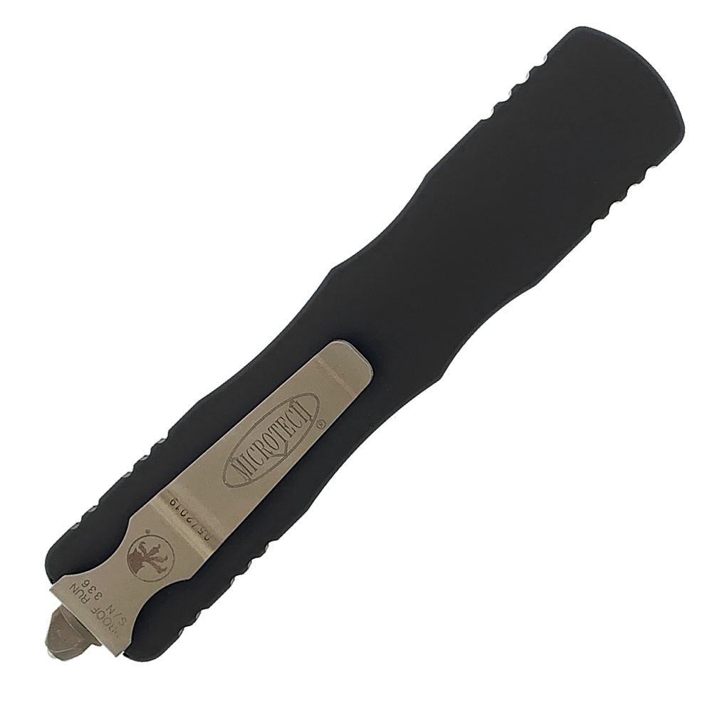 This Proof Run model features black anodized 6061-T6 aluminum handle scales. Black finished CTS-204P stainless steel double edge dagger blade. Bronze finished hardware, pocket clip, and glass breaker tip. The pocket clip has the Microtech Claw logo, Microtech logo, PROOF RUN serial number #336, and production date. Brand new in box.