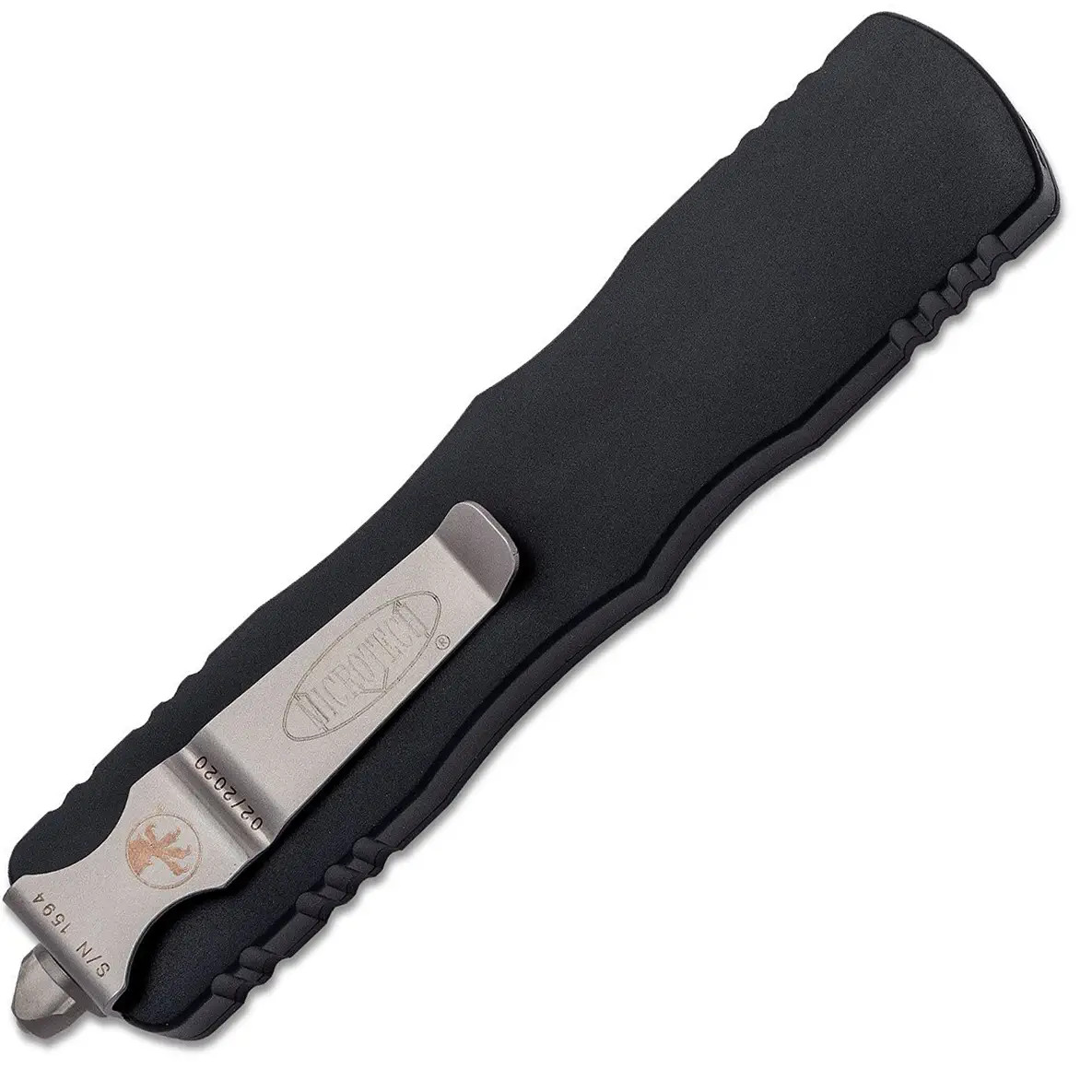 This model features black anodized 6061-T6 aluminum handle scales. Stonewash finished M390 stainless steel double edge dagger blade. Bead blast finished hardware, pocket clip, and glass breaker tip. The pocket clip has the Microtech Claw logo, Microtech logo, serial number, and production date. Brand new in box.