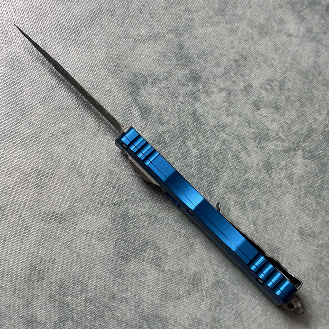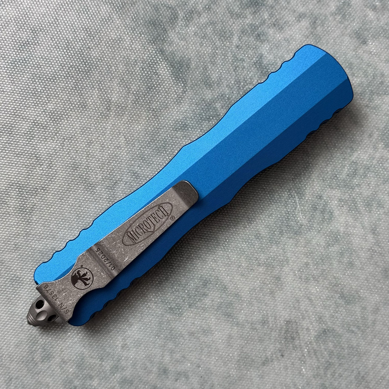 This model features blue anodized 6061-T6 aluminum handle scales. Apocalyptic finished M390 stainless steel double edge dagger blade. Bead blast finished hardware, pocket clip, and glass breaker tip. The pocket clip has the Microtech Claw logo, Microtech logo, serial number, and production date. Brand new in box.