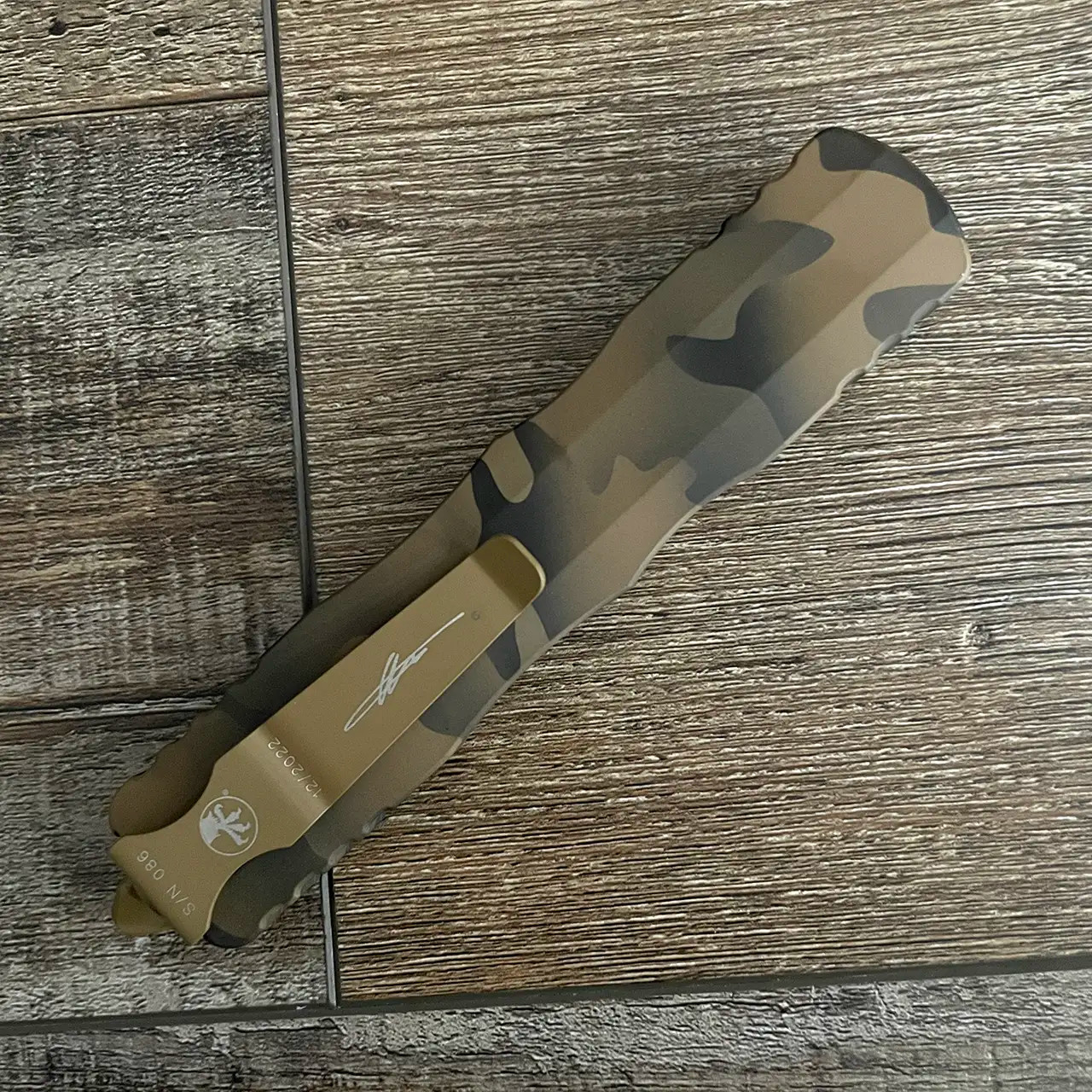 This limited edition signature series model features Coyote Camo Cerakote finished aluminum handle scales. Coyote Camo Cerakot finished M390 double edge dagger blade. Tan finished hardware, pocket clip, and glass breaker tip. The pocket clip has the Microtech Claw logo, Signature Series logo, serial number , and production date. Brand new in box.
