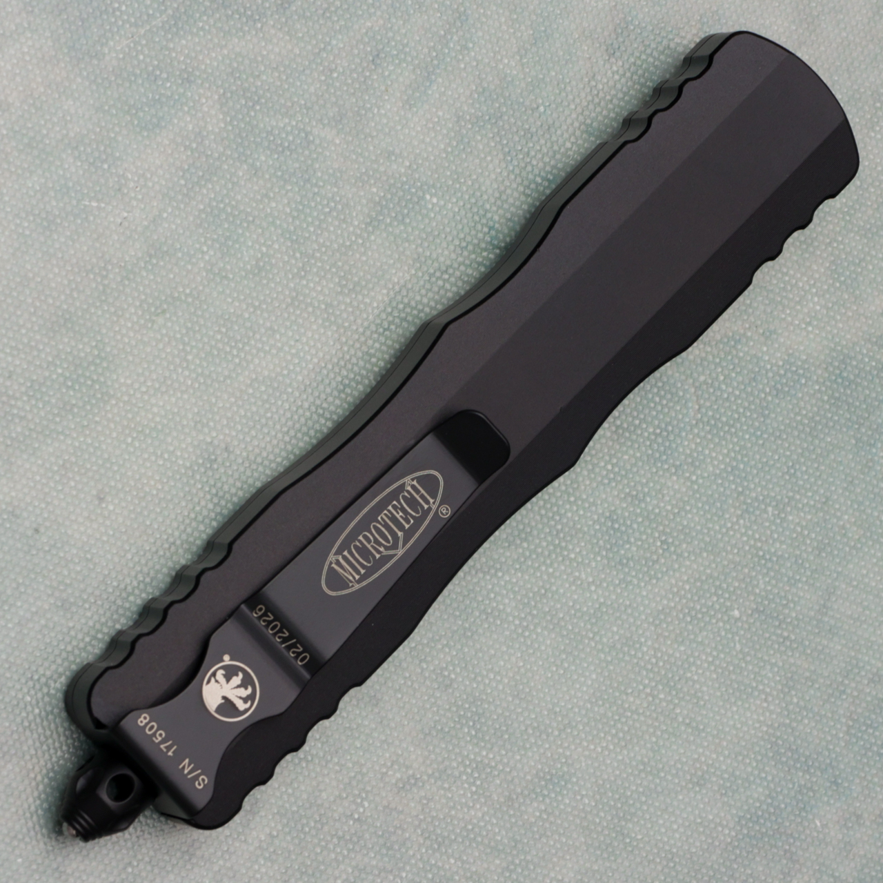 This model features black anodized aluminum handle scales. Black finished M390 stainless steel double edge dagger blade with one standard cutting edge and one fully serrated cutting edge. Black finished hardware, pocket clip, and glass breaker tip. The blade has the model information. The pocket clip has the Microtech Claw logo, serial number, and production date. Brand new in box.